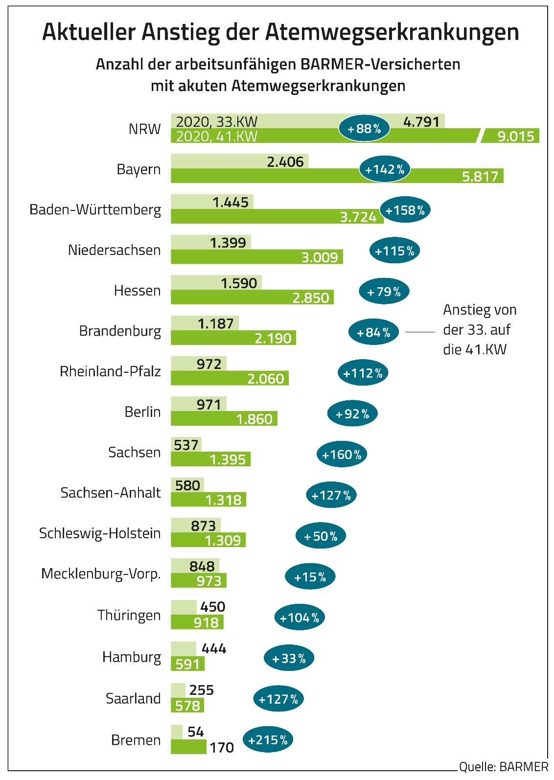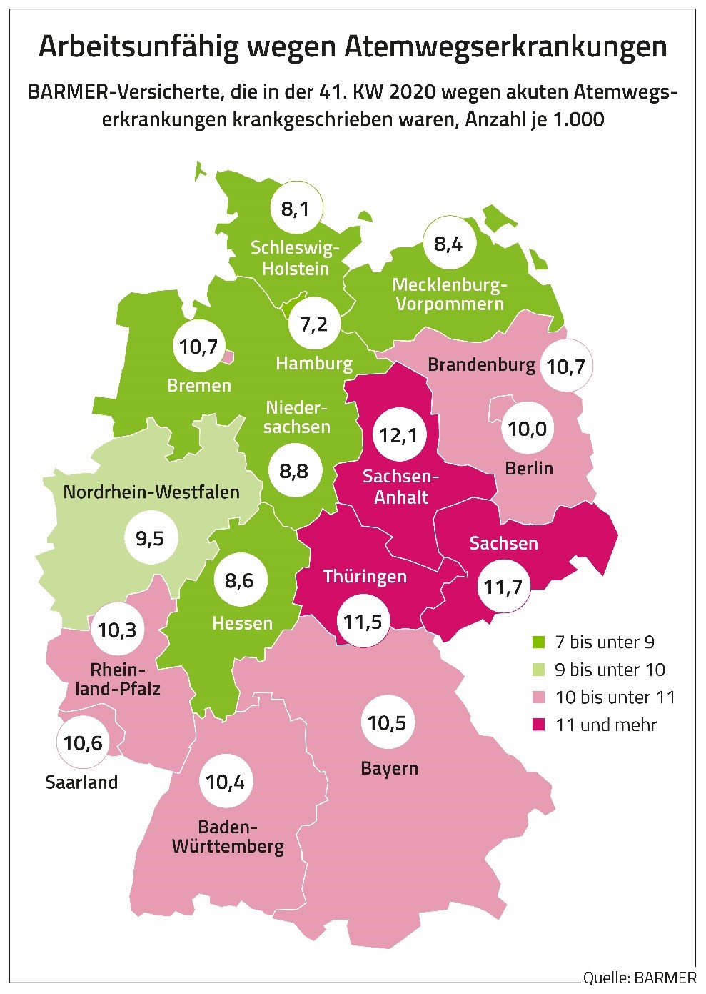 In Mecklenburg-Vorpommern waren 8,4 je 1.000 BARMER-Versicherte aufgrund einer Atemwegserkrankung arbeitsunfähig. Auch die Steigerungsraten sind regional sehr unterschiedlich. Während die Anzahl der krankgeschriebenen Versicherten im Jahr 2020 in Mecklenburg-Vorpommern von der 33. auf die 41. KW um 15 Prozent gestiegen ist, waren es in Baden-Württemberg 158 Prozent, in Sachsen 160 Prozent und in Bremen sogar 215 Prozent.