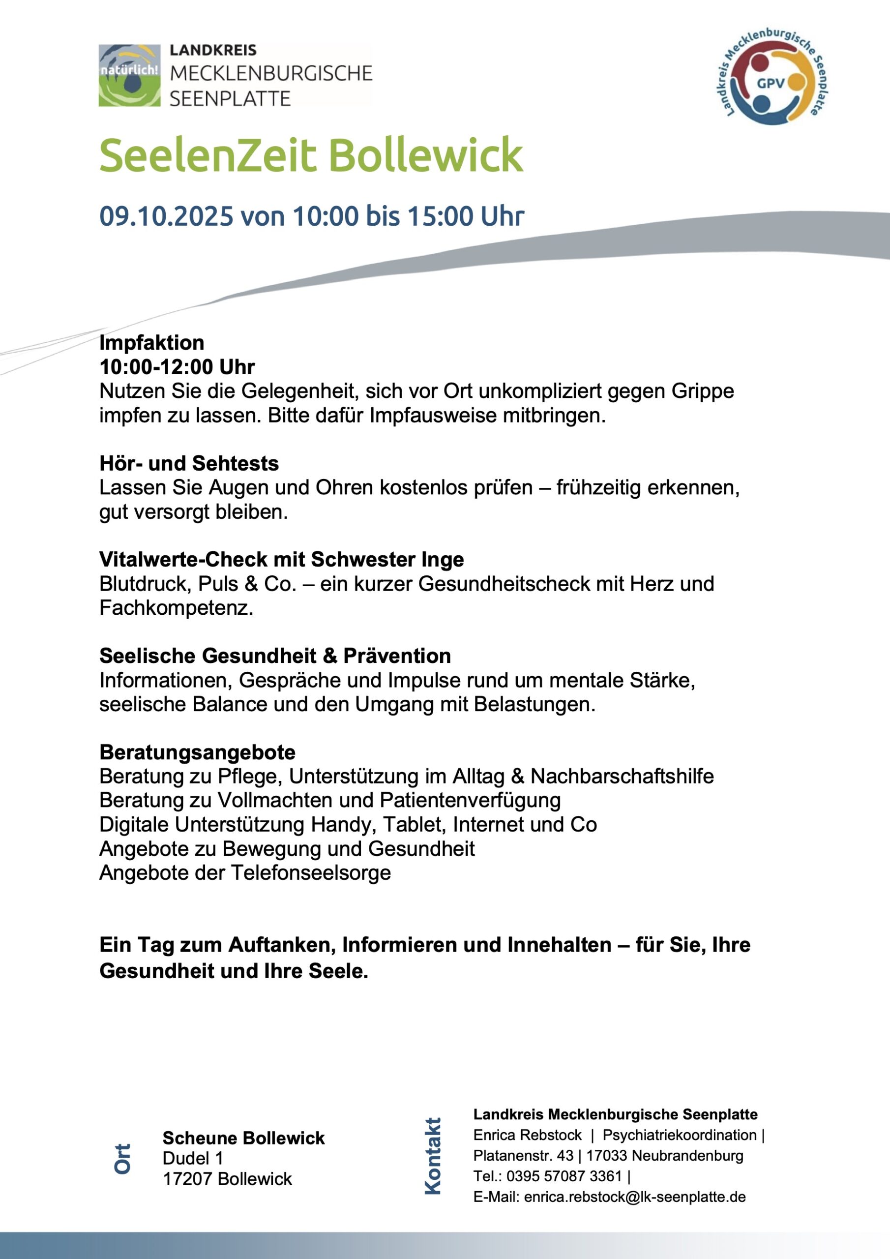 Im Rahmen der diesjährigen Woche der Seelischen Gesundheit, die vom 10. bis 20. Oktober in ganz Deutschland stattfindet, startet der Gemeindepsychiatrische Verbund (GPV) Mecklenburgische Seenplatte ein modellhaftes neues Format, das älteren Menschen in ländlichen Regionen gezielt niedrigschwellige Angebote zu seelischer Gesundheit, Prävention und Beratung zugänglich machen soll. Das Ziel ist, Menschen in höherem Lebensalter, die sonst schwer erreichbar sind, in ihrer Lebenswelt abzuholen und für wichtige Themen wie Einsamkeit, seelische Gesundheit im Alter, Pflege, Medikamentensucht oder Alltagsbewältigung zu sensibilisieren – mit einem offenen, freundlichen Veranstaltungsformat in vertrauter Umgebung. Gleichzeitig werden auch Gesundheitschecks (Blutdruckmessung, Pulsmessung, Seh- und Hörtests) angeboten.