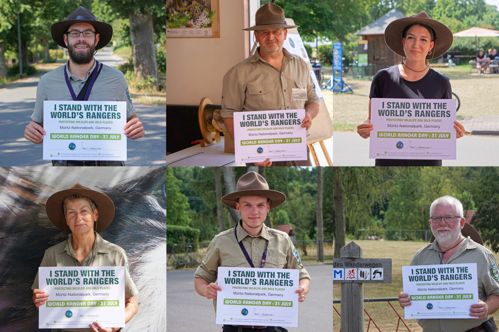 Foto oben: „We stand with the World’s Rangers“, obere Reihe v. l.: Thomas Köhler, Uwe Lemke, Volunteer-Rangerin Lisa Klug, untere Reihe v. l.: Martina Fuhrmann, Lars de Wilde, Ralf Werner