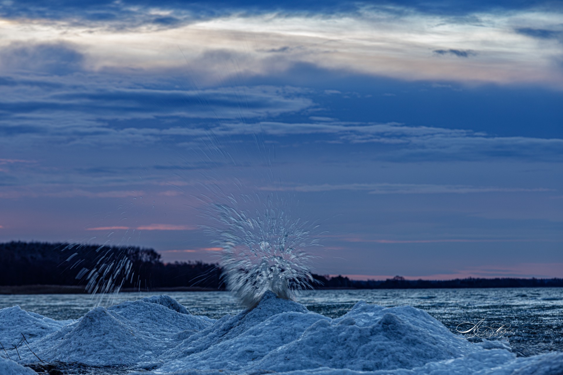 Hochgeschleuderte Eisstückchen haben einen „Vulkan“ geformt, das Wasser spritzt wie Lava – und André hat genau im richtigen Moment abgedrückt.