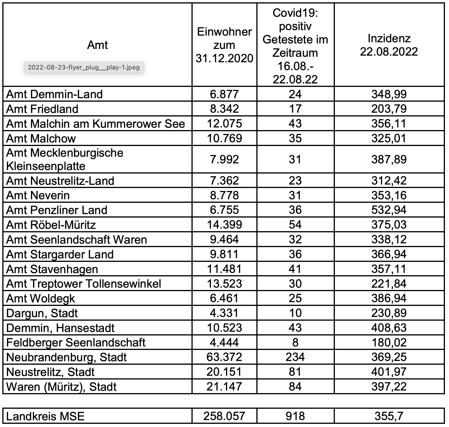Und hier die aktuellen Corona-Inzidenzen des Landkreises Mecklenburgische Seenplatte – aufgeschlüsselt nach Städten und Ämtern – im Überblick: