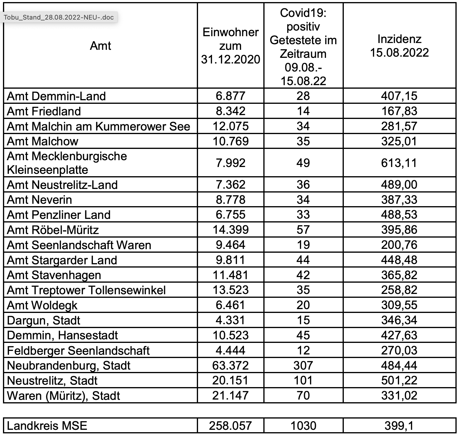 Und hier die aktuellen Corona-Inzidenzen des Landkreises Mecklenburgische Seenplatte – aufgeschlüsselt nach Städten und Ämtern – im Überblick: