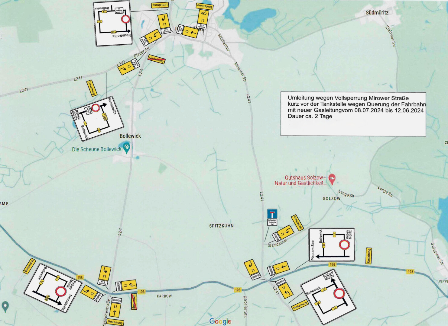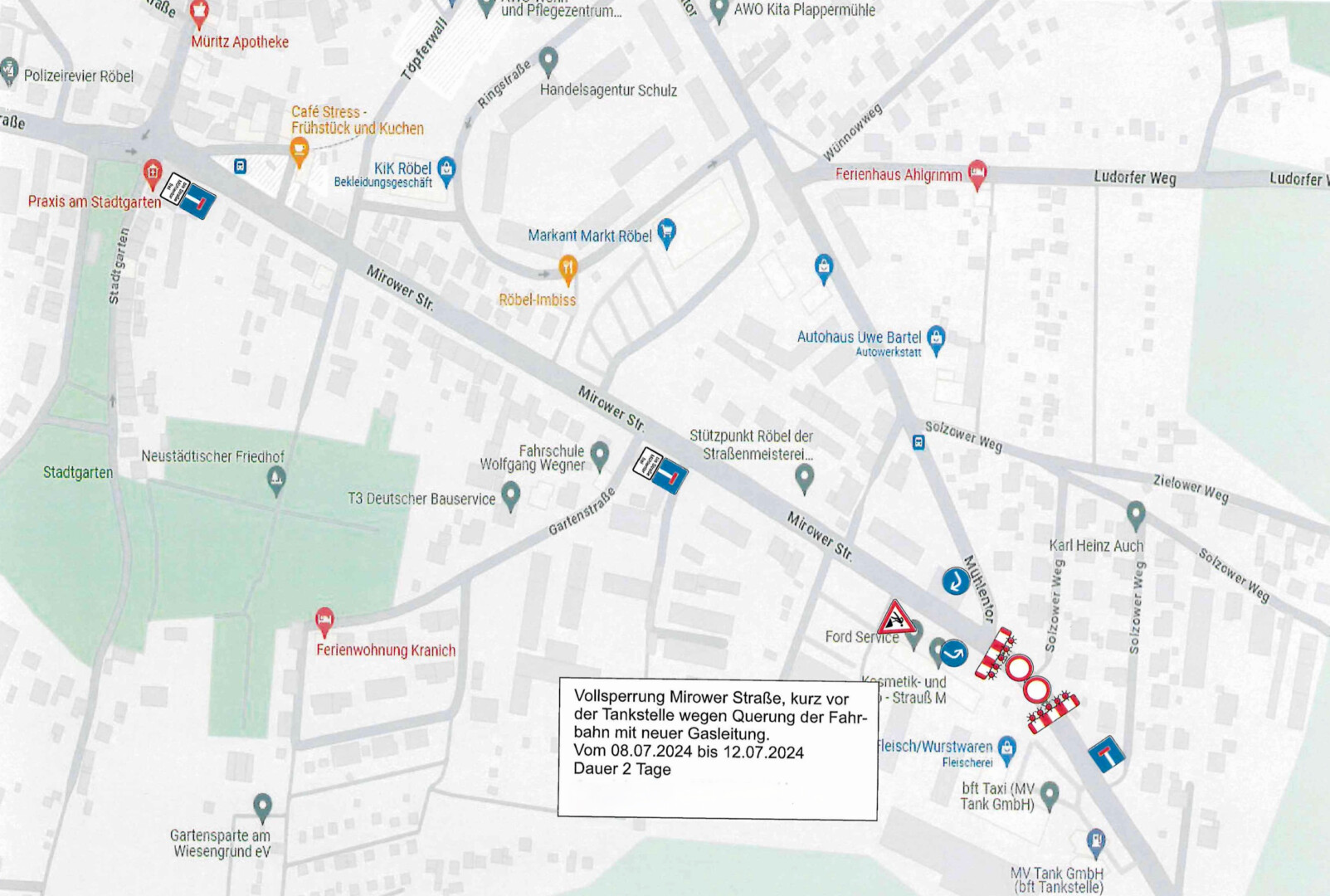 In Röbel gibt es seit heute Bauarbeiten in der Mirower Straße. Dort werden neue Gasleitungen verlegt.
