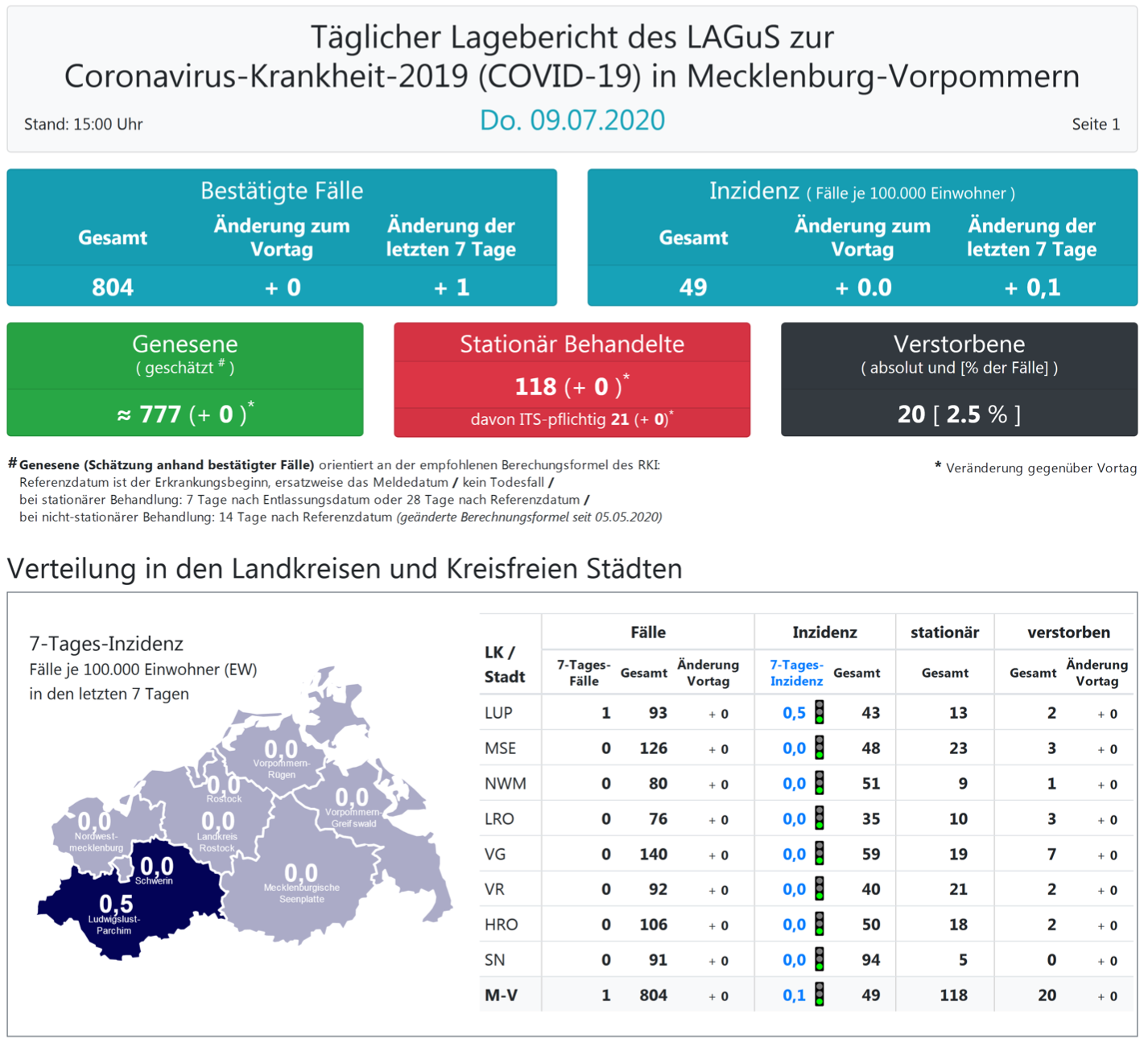 Landesweit müssen oder mussten 118 Menschen den Angaben zufolge in Kliniken behandelt werden – 21 von ihnen auf Intensivstationen. Laut einer Schätzung des Robert Koch-Instituts (RKI) sind in Mecklenburg-Vorpommern 777 Personen der positiv getesteten Menschen von einer Covid-19-Erkrankung genesen. Insgesamt gab es bislang 20 Todesfälle im Land.