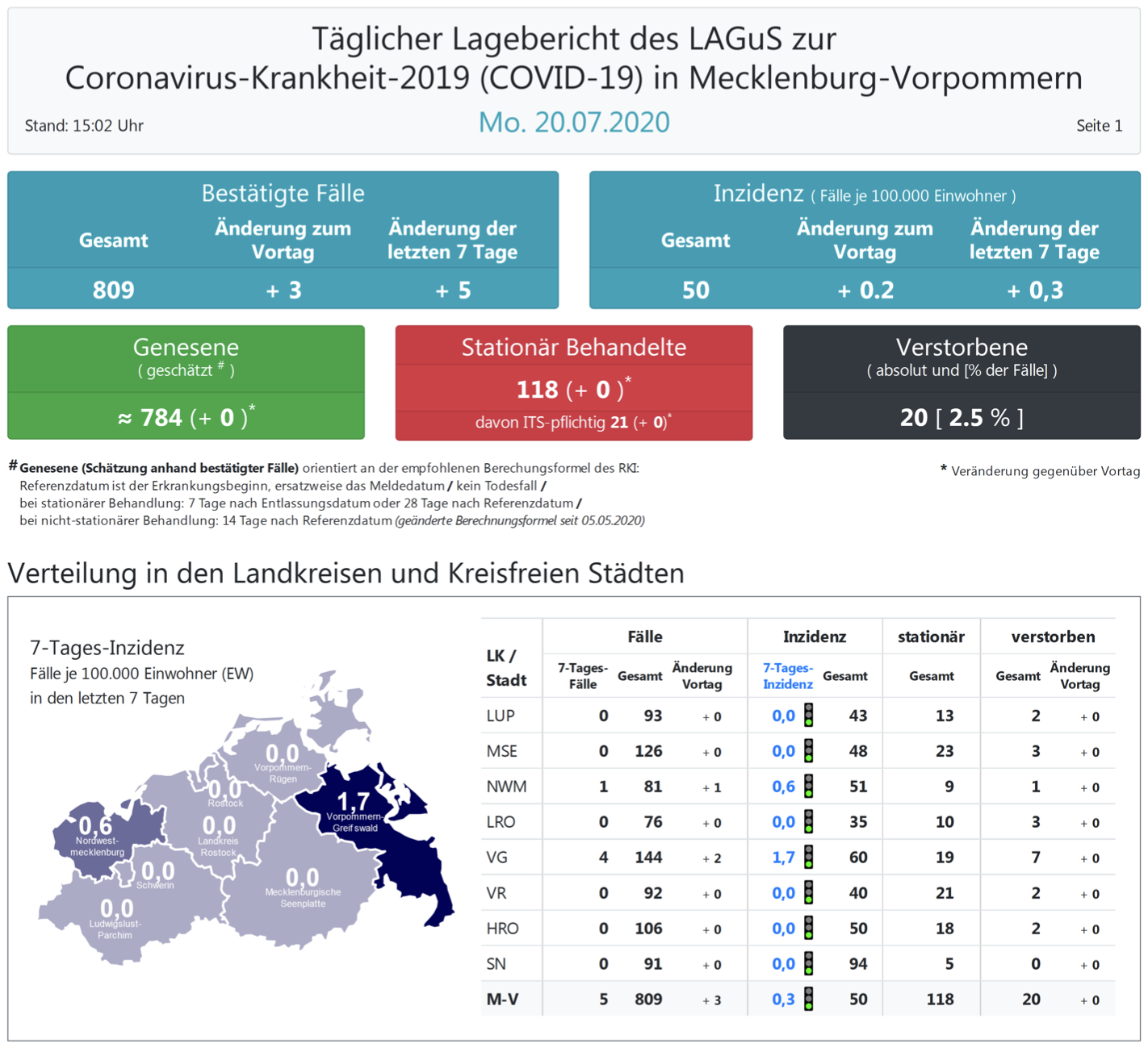 Laut einer Schätzung des Robert Koch-Instituts (RKI) sind in Mecklenburg-Vorpommern 784 Personen der positiv getesteten Menschen von einer Covid-19-Erkrankung genesen. Insgesamt gab es bislang 20 Todesfälle im Land.