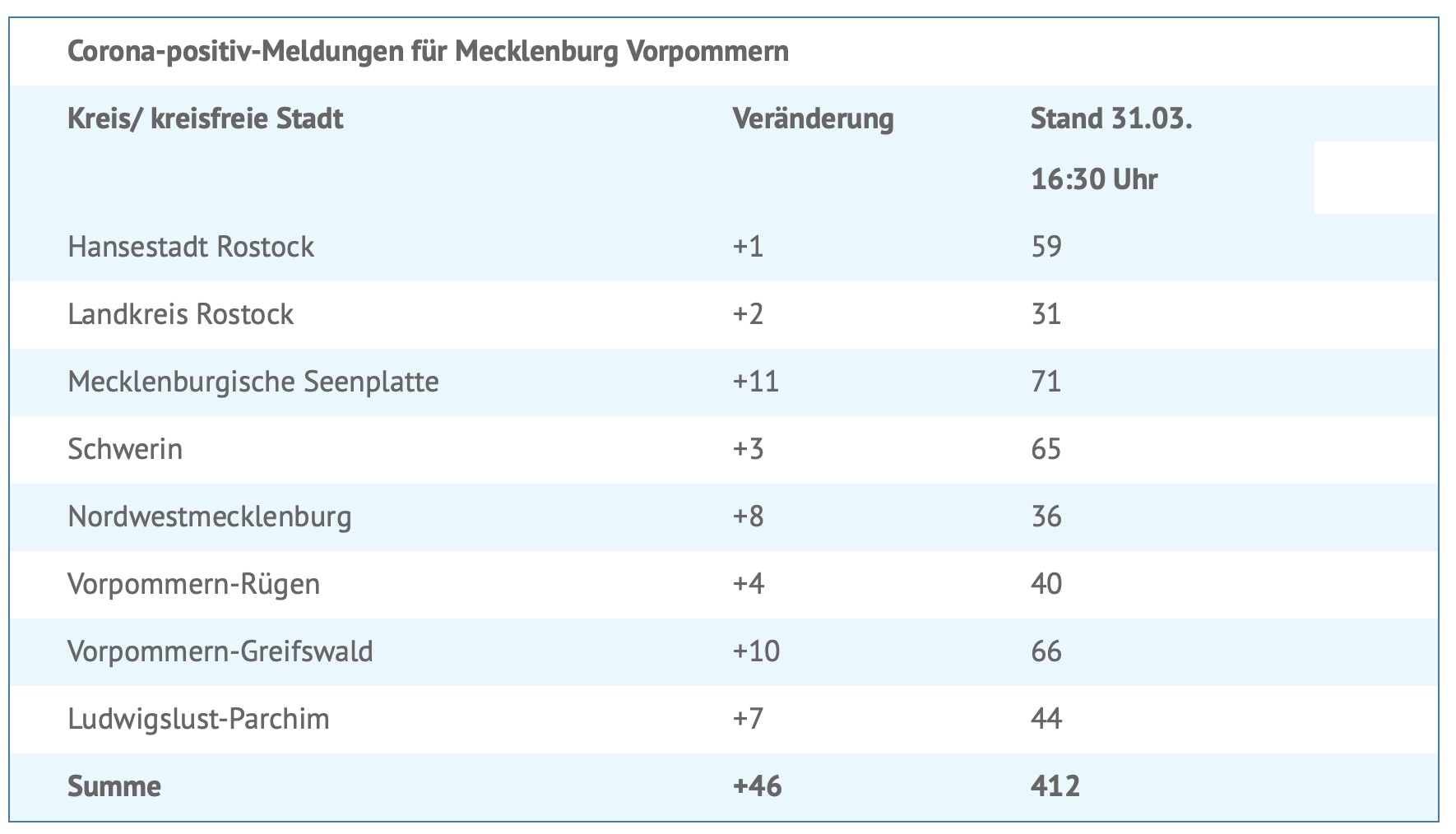 Wieder ein deutlicher Anstieg: Seit gestern wurden 46 neue Corona-Infektionen aus den Landkreisen und kreisfreien Städten gemeldet, davon 11 im Landkreis Mecklenburgische Seenplatte. Insgesamt wurden bislang 412 Menschen in MV positiv auf das Virus getestet.