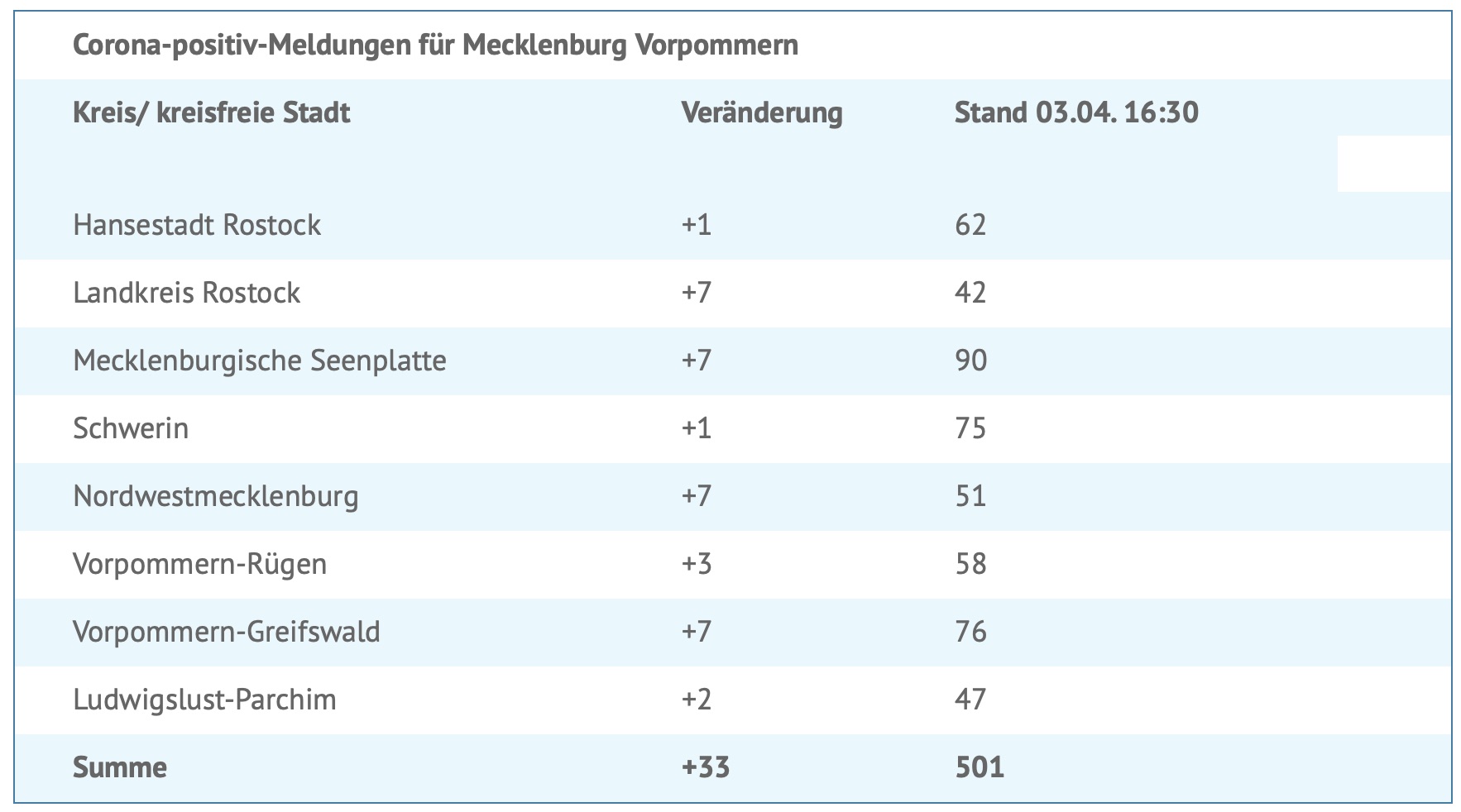 Seit gestern wurden 33 neue Corona-Infektionen aus den Landkreisen und kreisfreien Städten gemeldet, sieben davon aus dem Landkreis Mecklenburgische Seenplatte. Insgesamt wurden bislang 501 Menschen in MV positiv auf das Virus getestet. 69 Personen mussten/müssen im Krankenhaus behandelt werden, zwölf davon auf einer Intensivstation.