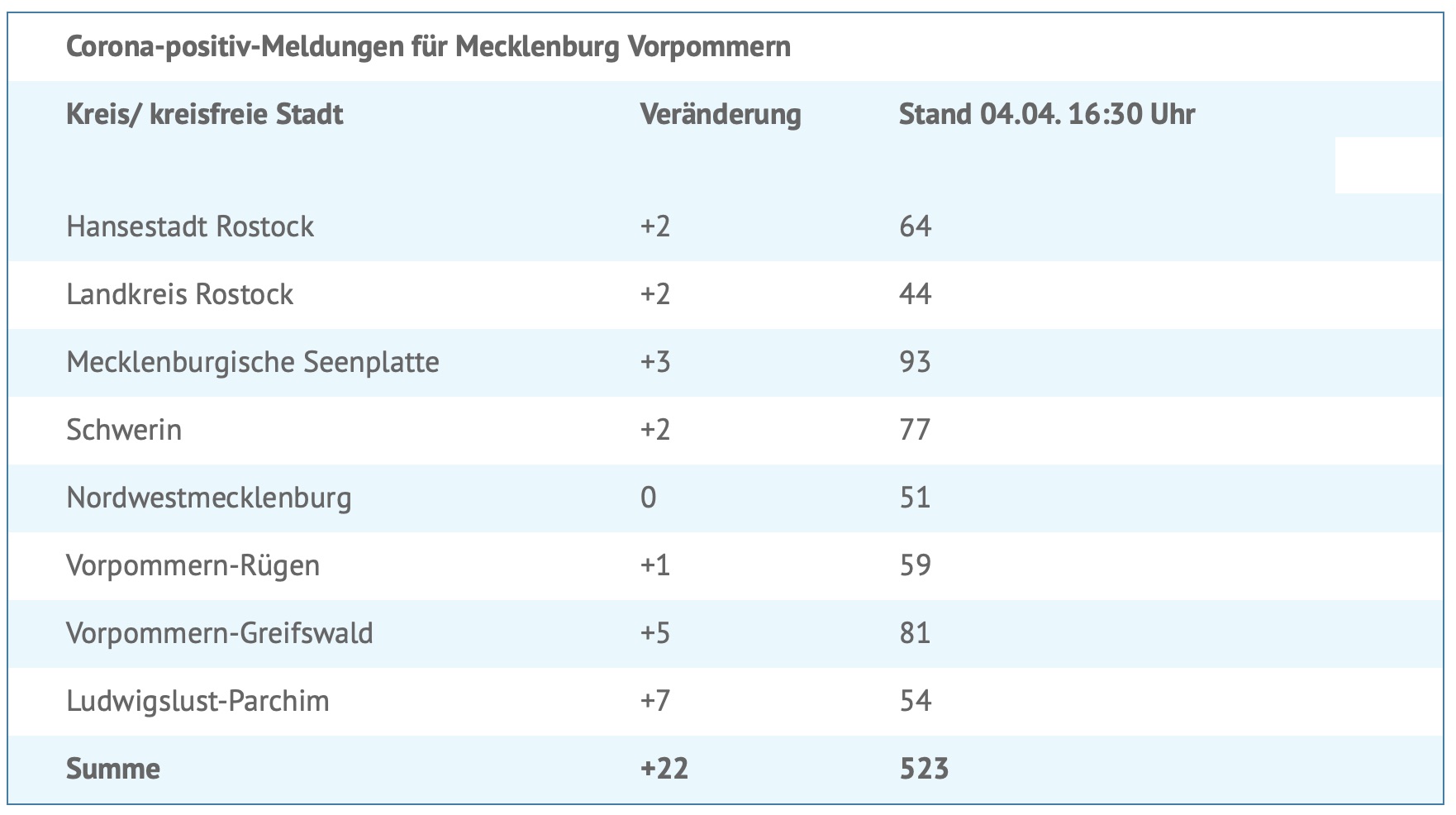 Seit gestern wurden 22 neue Corona-Infektionen aus den Landkreisen und kreisfreien Städten gemeldet, davon drei im Landkreis Mecklenburgische Seenplatte. Insgesamt wurden bislang 523 Menschen in MV positiv auf das Virus getestet.