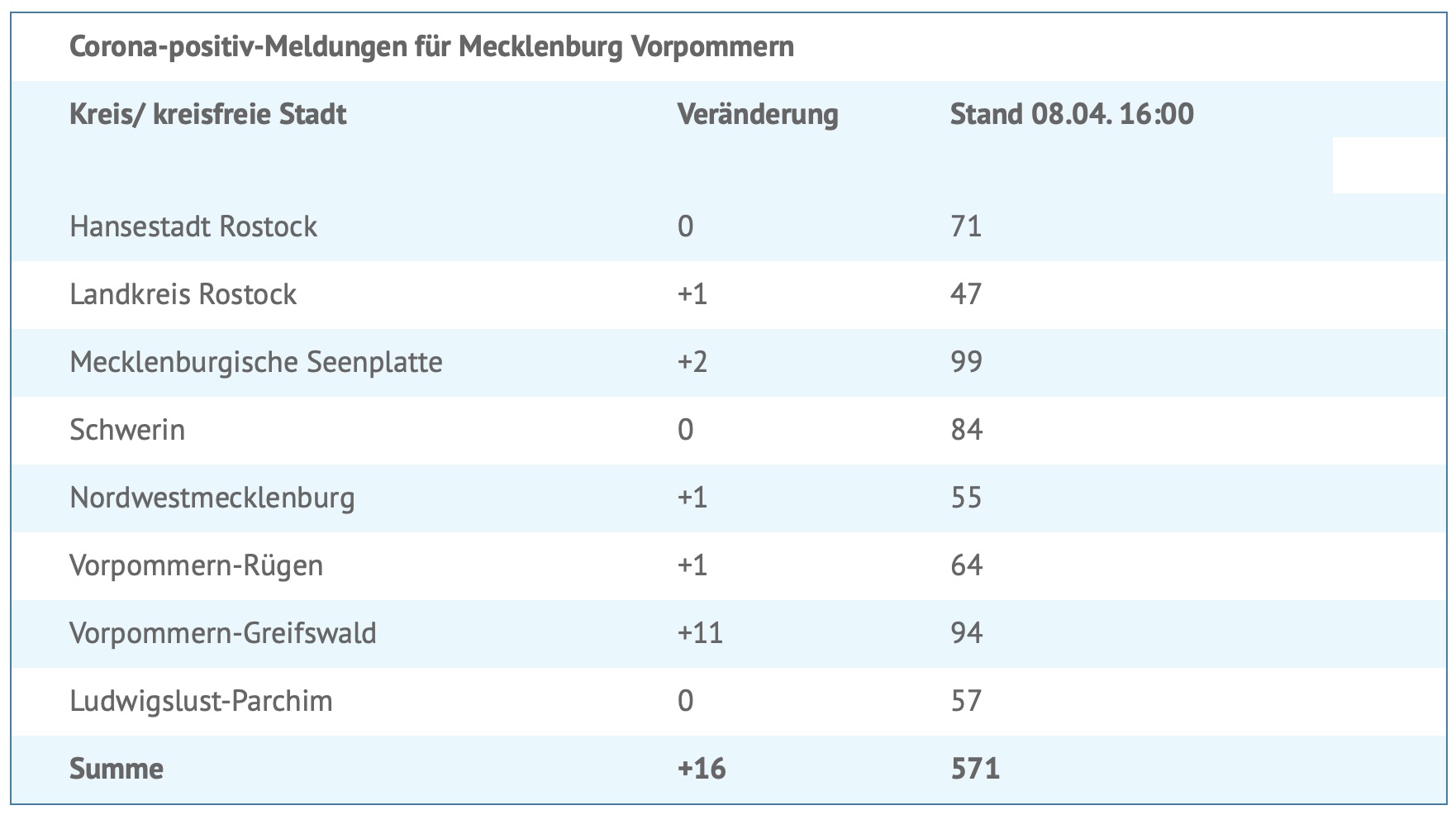 Seit gestern wurden 16 neue Corona-Infektionen aus den Landkreisen und kreisfreien Städten gemeldet, davon zwei aus dem Landkreis Mecklenburgische Seenplatte. Insgesamt wurden bislang 571 Menschen in MV positiv auf das Virus getestet. 80 Personen mussten/müssen im Krankenhaus behandelt werden, 15 davon auf einer Intensivstation. Insgesamt gab es bislang elf Sterbefälle in Mecklenburg-Vorpommern.