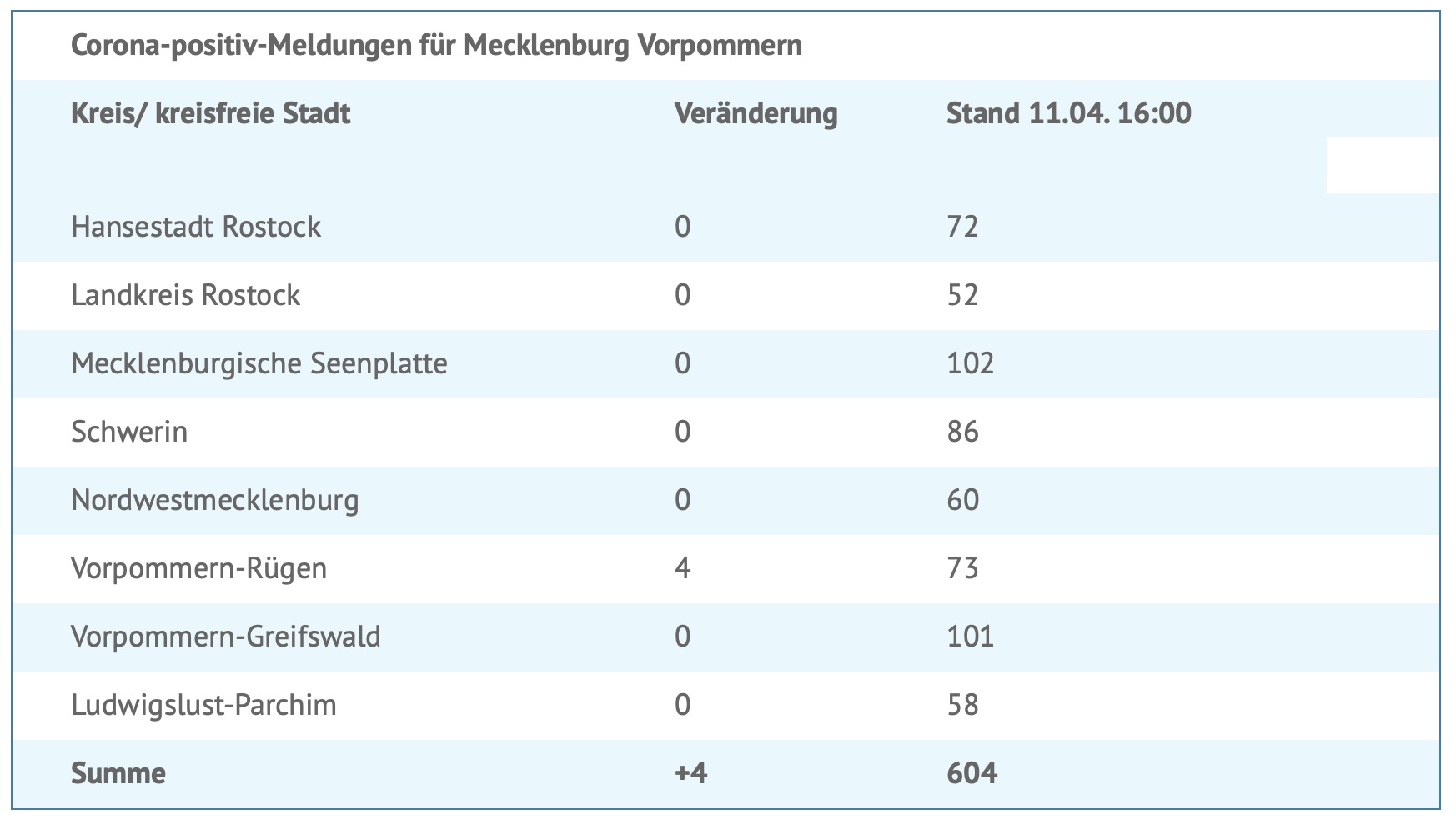 Seit gestern wurden vier neue Corona-Infektionen, alle aus dem Landkreis Vorpommern-Rügen, gemeldet. Insgesamt wurden bislang 604 Menschen in MV positiv auf das Virus getestet. 88 Personen mussten/müssen im Krankenhaus behandelt werden, 15 davon auf einer Intensivstation.