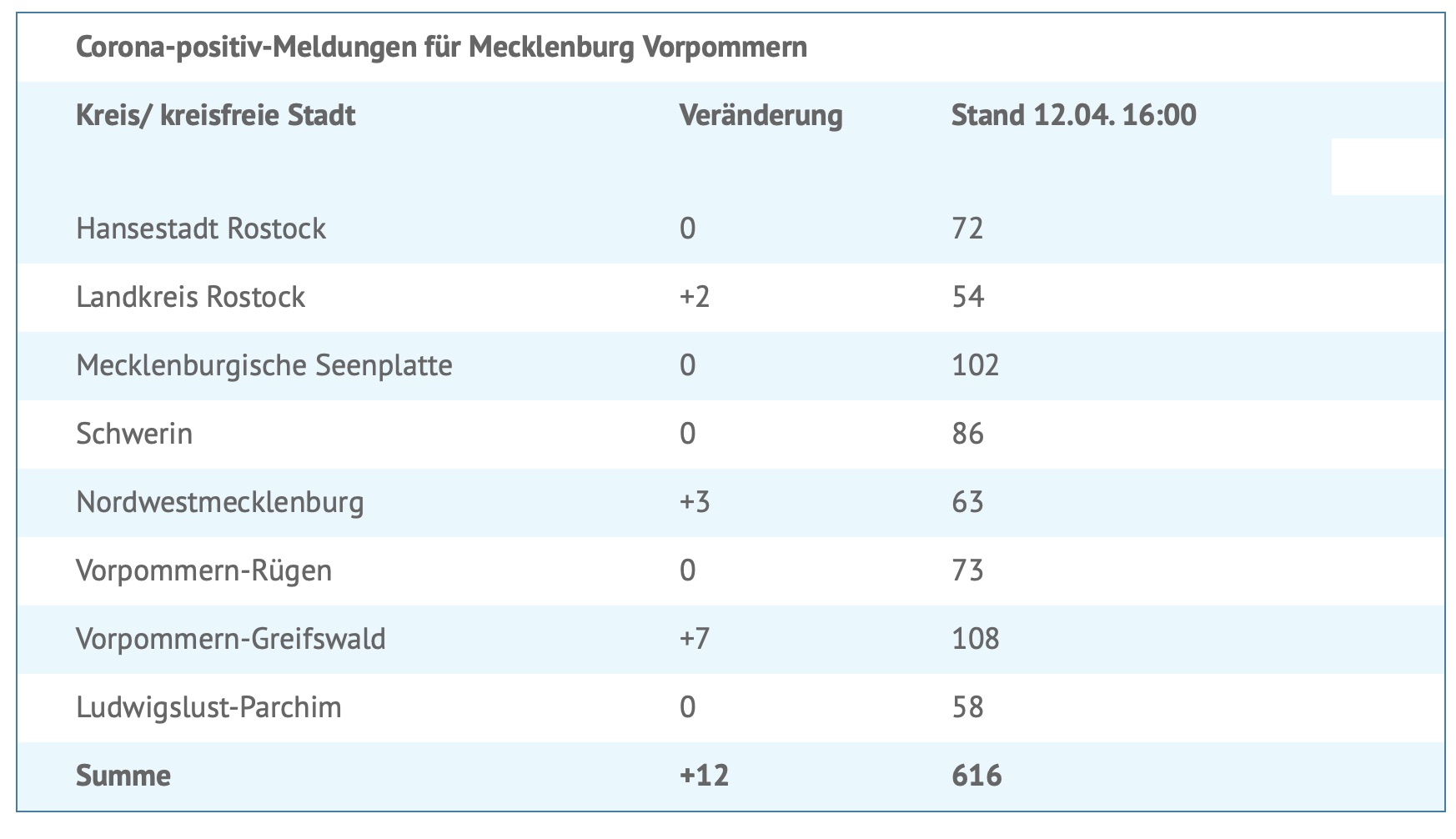 Seit gestern wurden zwölf neue Corona-Infektionen gemeldet.Die sieben Fälle aus dem Landkreis Vorpommern-Greifswald stammen aus dem Pflegeheim Tutow. Fünf Bewohner und zwei Beschäftigte, allesamt ohne Symptome, wurden im Rahmen der Umgebungsuntersuchungen positiv getestet.