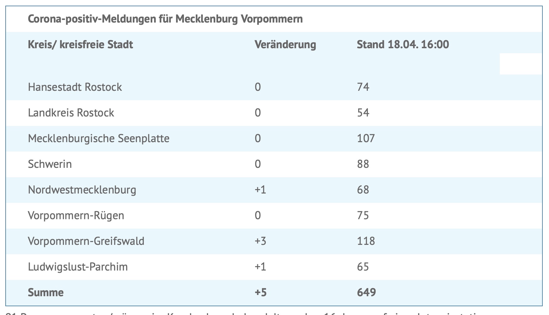 Seit gestern wurden fünf neue Corona-Infektionen gemeldet. Insgesamt wurden bislang 649 Menschen in MV positiv auf das Virus getestet. 91 Personen mussten/müssen im Krankenhaus behandelt werden, 16 davon auf einer Intensivstation.