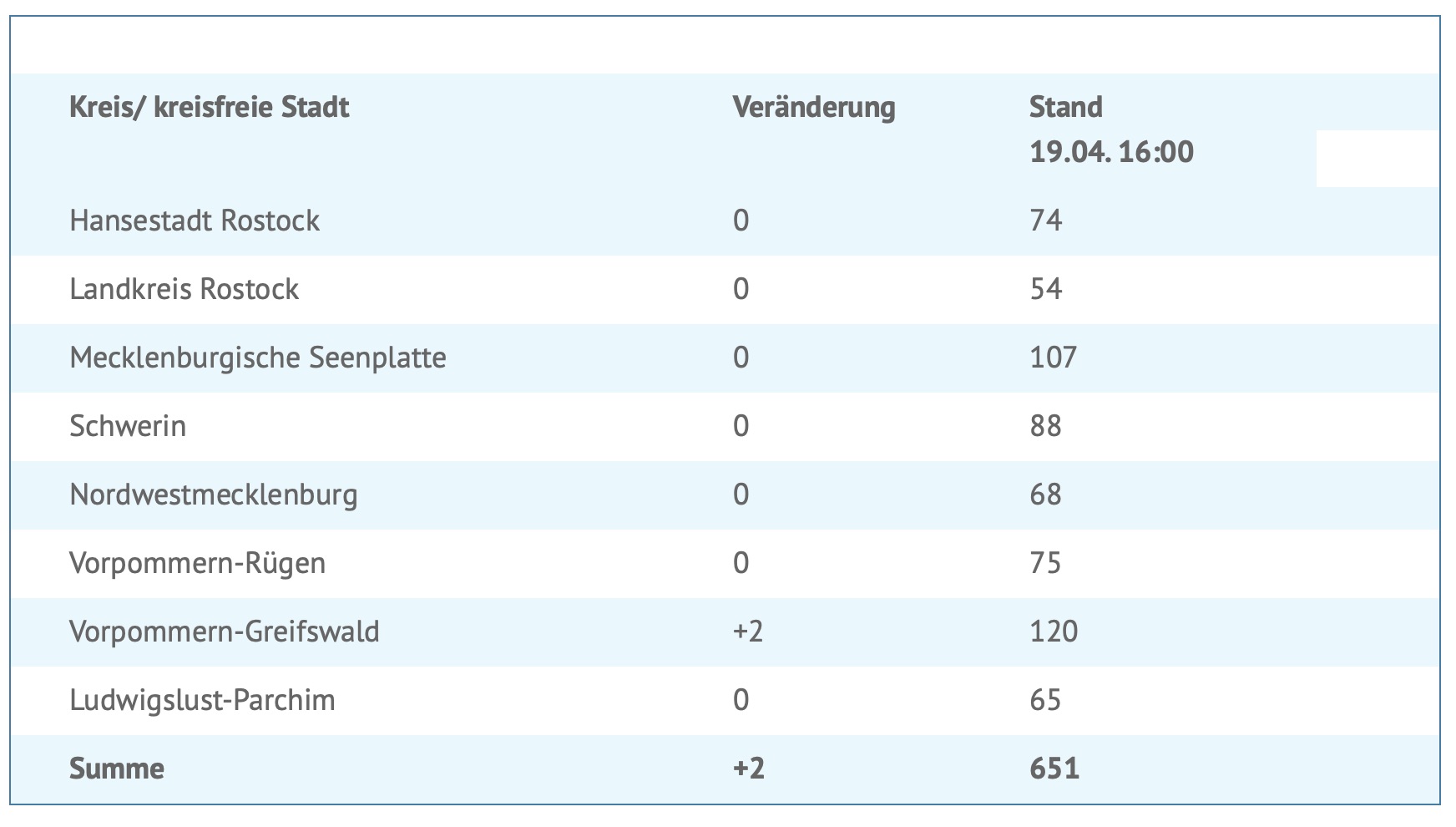 Seit gestern wurden zwei neue Corona-Infektionen gemeldet. Insgesamt wurden bislang 651 Menschen in MV positiv auf das Virus getestet. 91 Personen mussten/müssen im Krankenhaus behandelt werden, 16 davon auf einer Intensivstation.