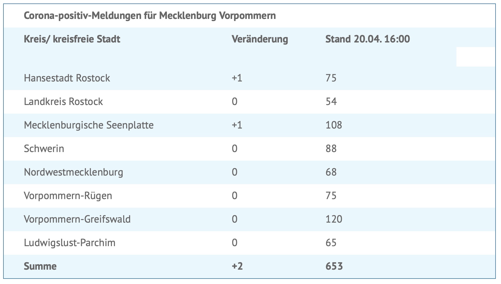 Seit gestern wurden zwei neue Corona-Infektionen gemeldet, davon einer im Landkreis Mecklenburgische Seenplatte. Insgesamt wurden bislang 653 Menschen in MV positiv auf das Virus getestet.