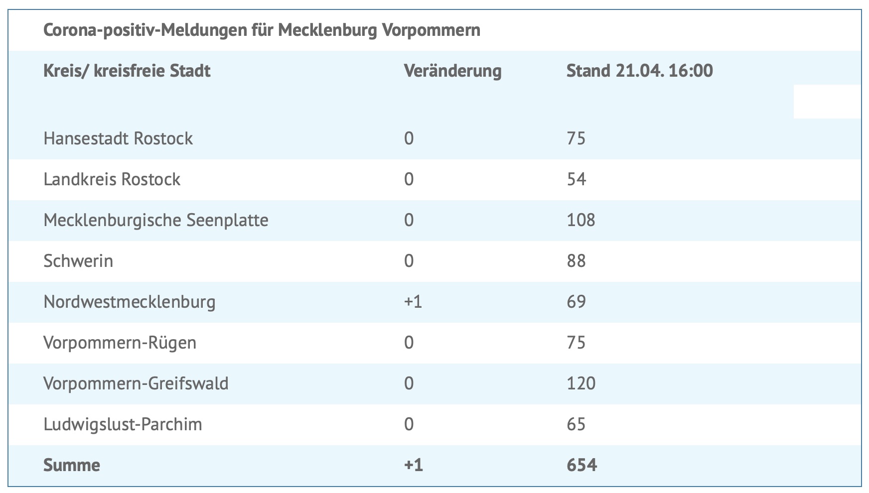 Seit gestern wurde eine neue Corona-Infektion gemeldet. Insgesamt wurden bislang 654 Menschen in MV positiv auf das Virus getestet. 90 Personen mussten/müssen im Krankenhaus behandelt werden, 16 davon auf einer Intensivstation. Insgesamt gab es bislang 15 Sterbefälle in Mecklenburg-Vorpommern.