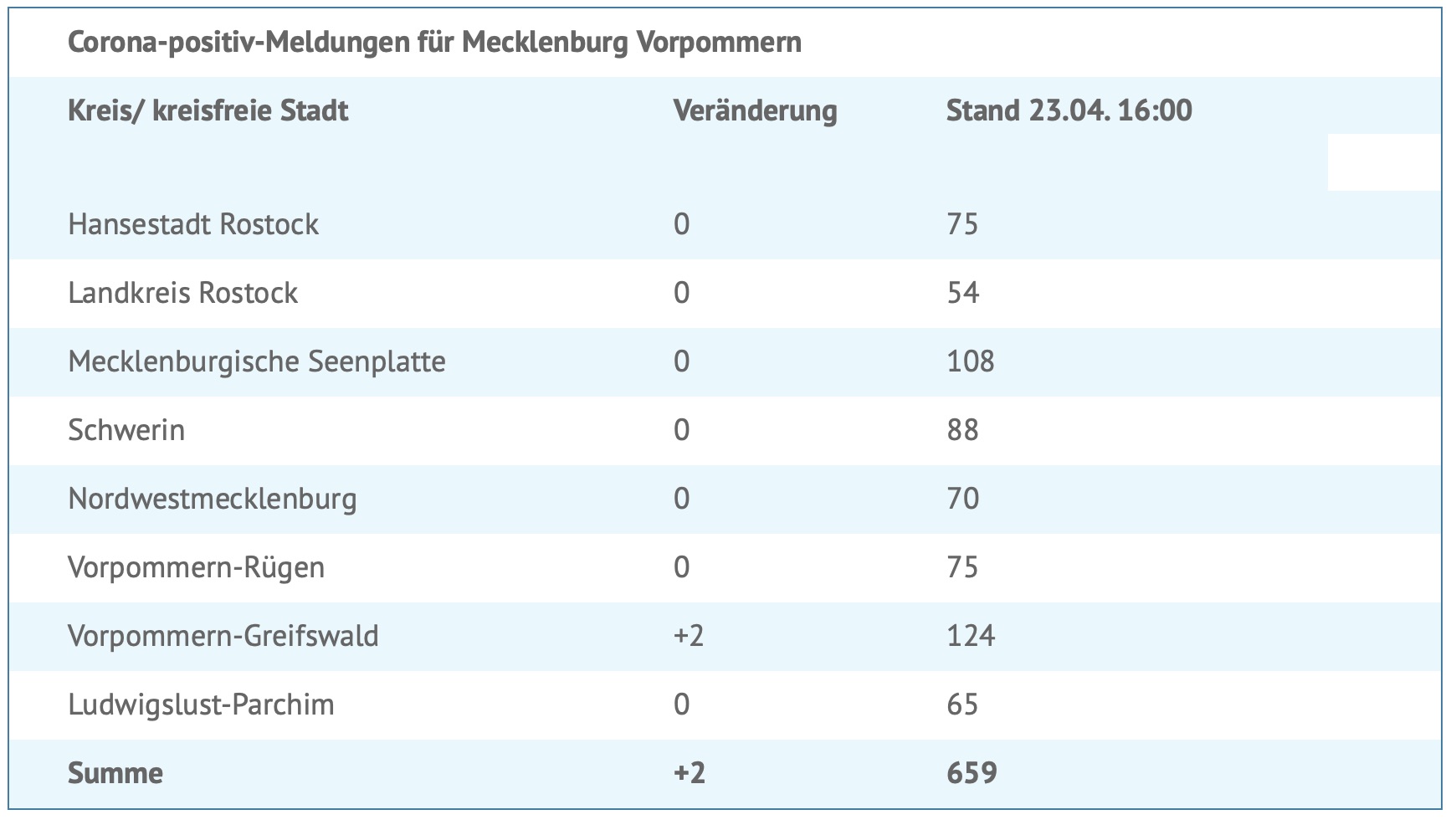 Seit gestern wurden zwei neue Corona-Infektionen gemeldet. Insgesamt wurden bislang 659 Menschen in MV positiv auf das Virus getestet. 92 Personen mussten/müssen im Krankenhaus behandelt werden, 17 davon auf einer Intensivstation.
