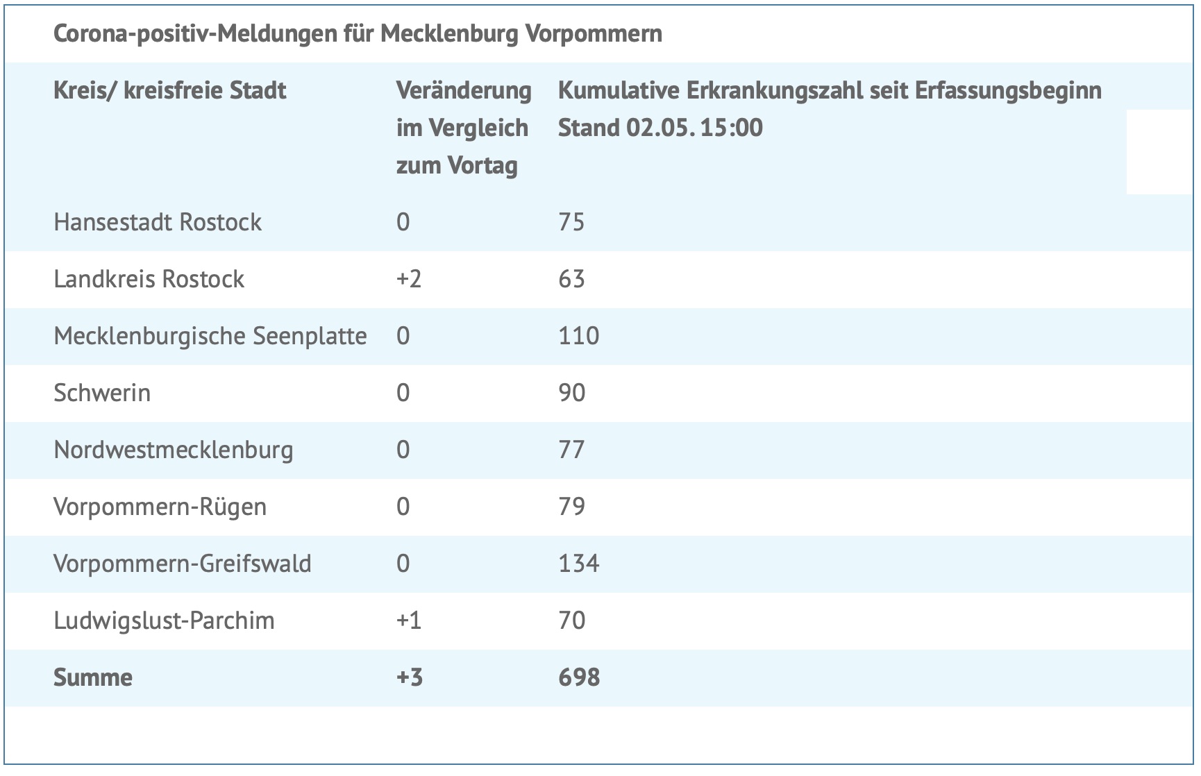 Seit gestern wurden drei weitere Corona-Infektionen gemeldet. Insgesamt wurden bislang 698 Menschen in MV positiv auf das Virus getestet.