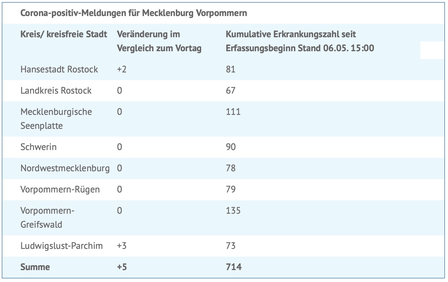 Seit gestern wurden fünf weitere Corona-Infektionen gemeldet. Insgesamt wurden bislang 714 Menschen in MV positiv auf das Virus getestet.
