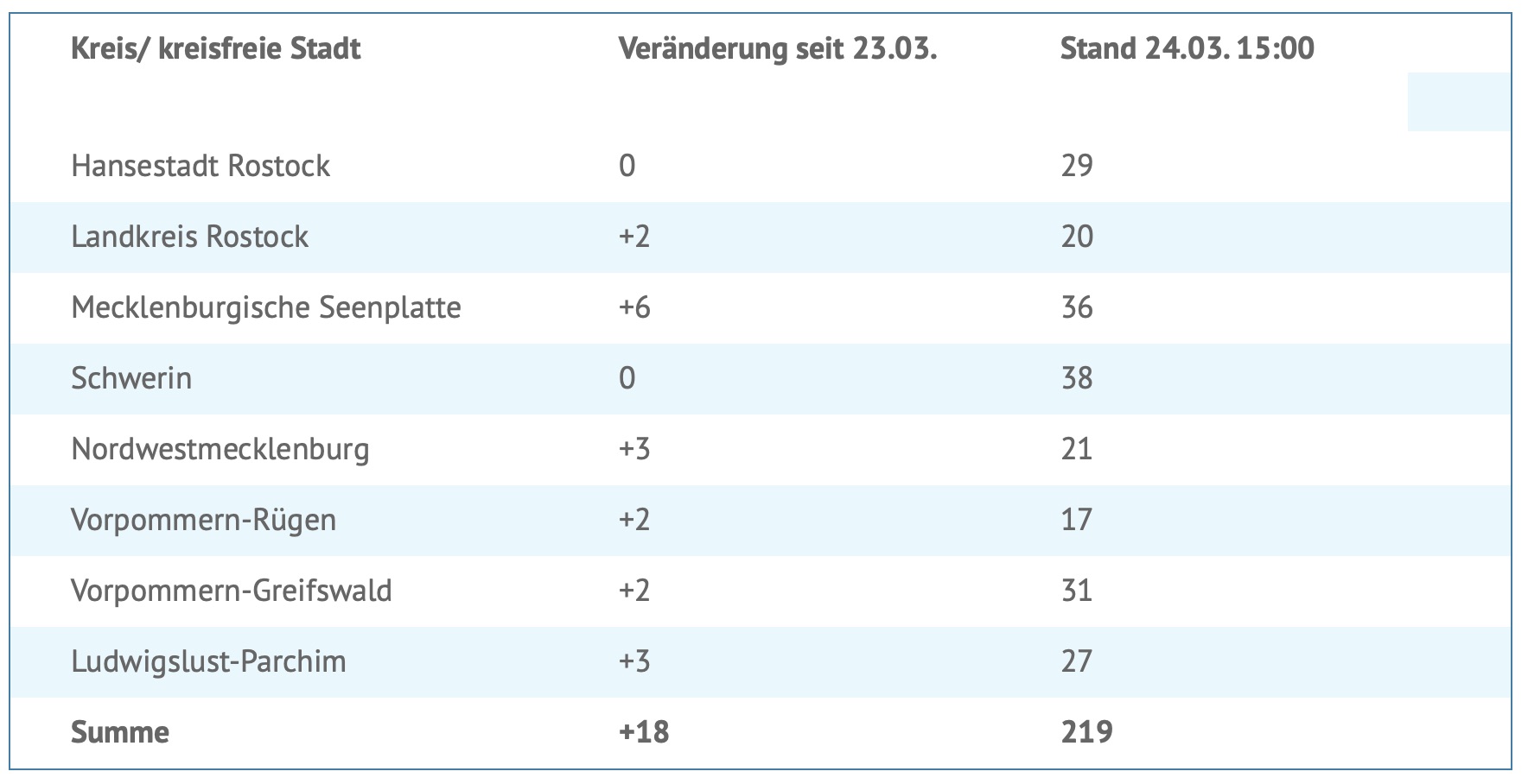 Insgesamt wurden bislang 219 Menschen in MV positiv auf das Virus getestet. 14 Personen mussten/müssen im Krankenhaus behandelt werden, drei davon auf einer Intensivstation.
