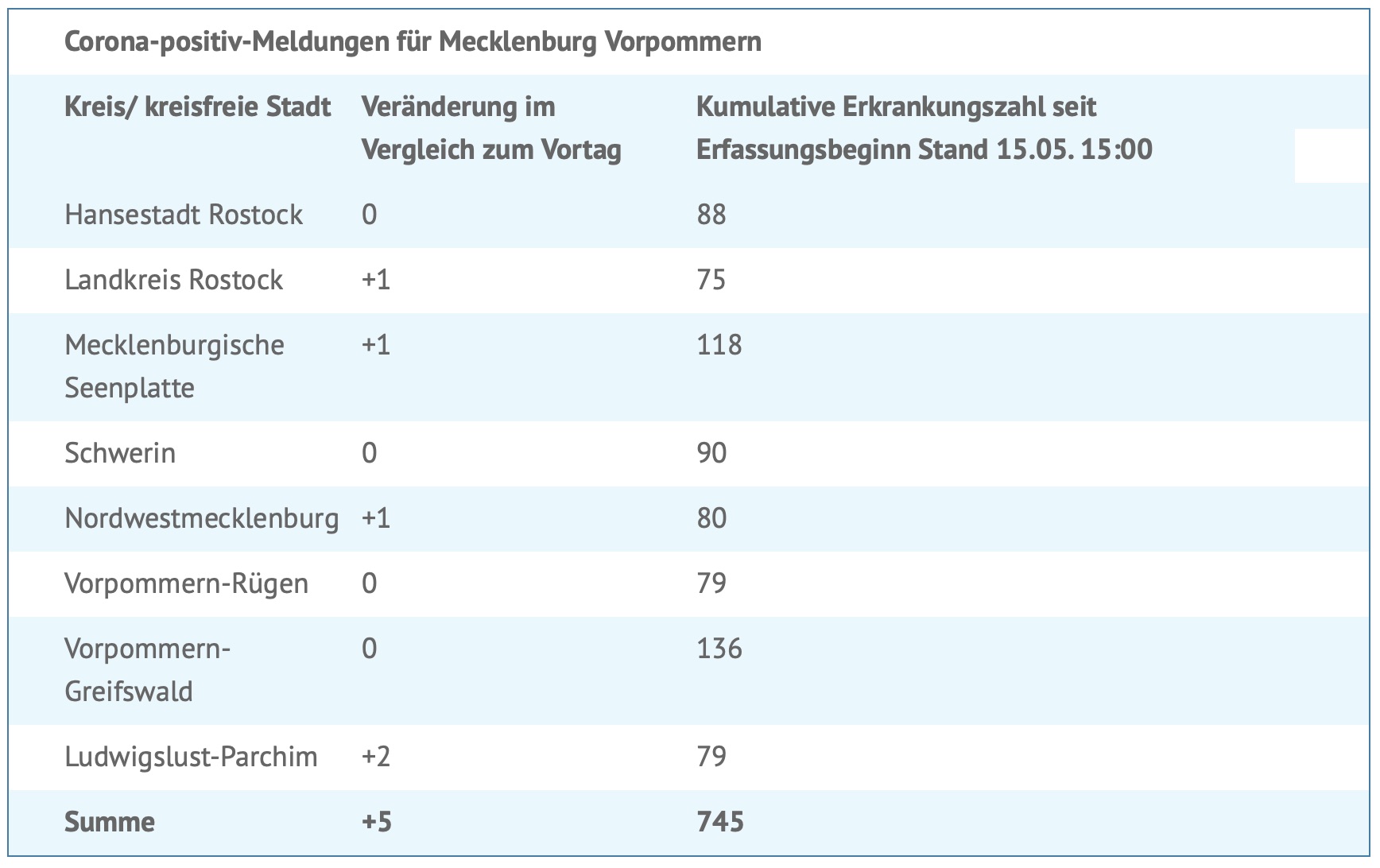 Seit gestern wurden fünf weitere Corona-Infektionen gemeldet, davon eine im Landkreis Mecklenburgische Seenplatte. Insgesamt wurden bislang 745 Menschen in MV positiv auf das Virus getestet.