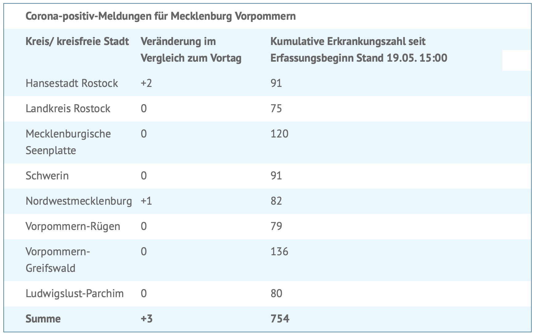 Nachdem es gestern erstmal seit zwei Monaten einen Tag ohne neu gemeldete Corona-Infektionen in Mecklenburg-Vorpommern gab, sind seit gestern wieder drei neue Fälle hinzu gekommen.