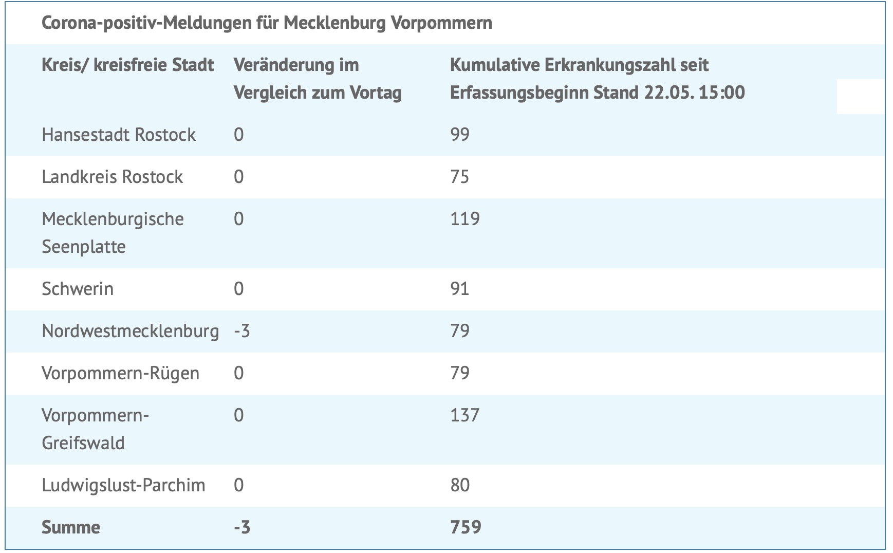 Im Landkreis Nordwestmecklenburg wurden drei Infektionsfälle aus der Statistik gelöscht. Bei Nachtestungen haben sich diese Fälle nicht bestätigt. Zwei der drei Betroffenen mussten aufgrund ihrer Symptomatik im Krankenhaus behandelt werden. Auch diese Zahl hat sich also im Vergleich zu gestern geändert.