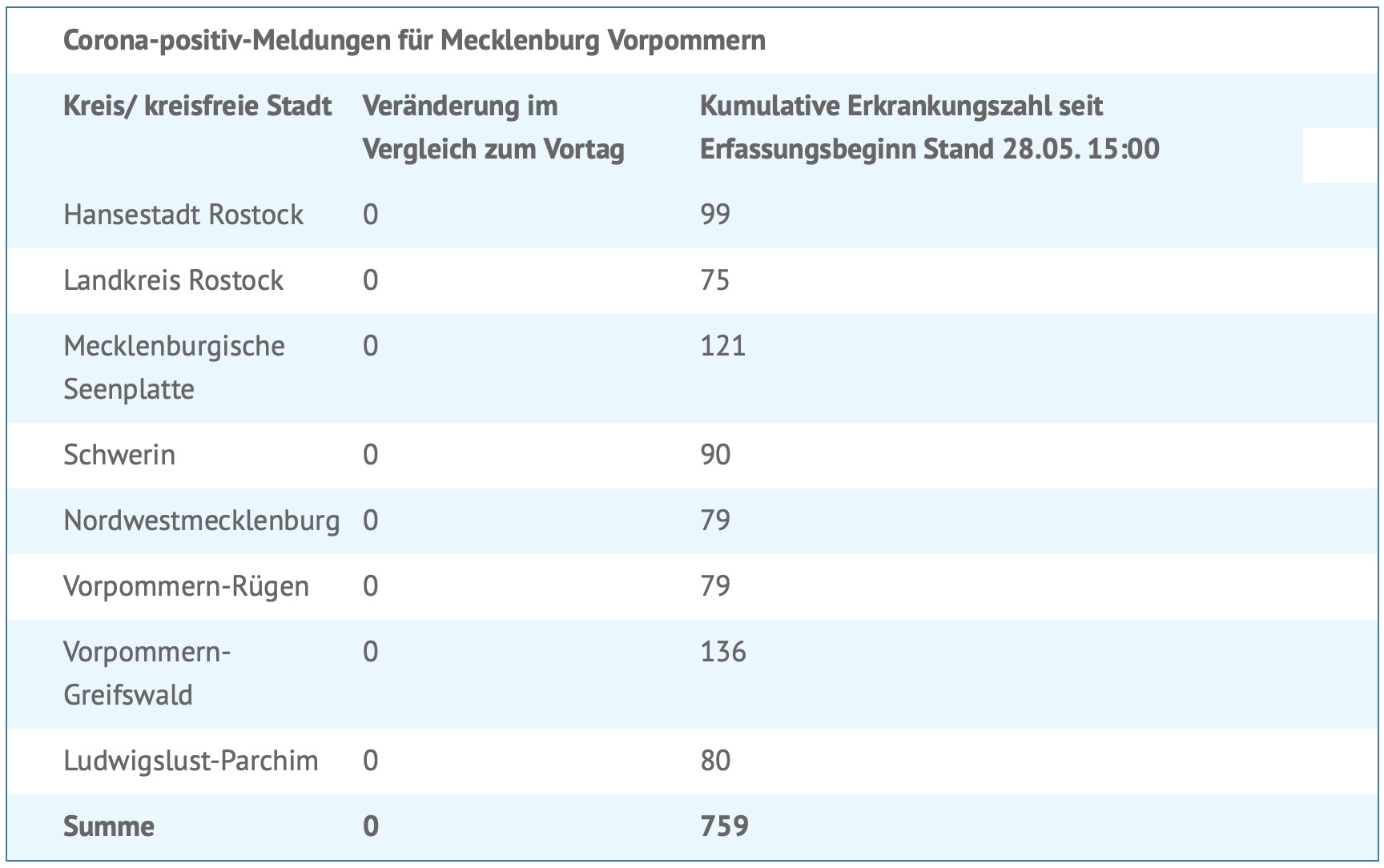 112 Personen mussten/müssen bislang insgesamt im Krankenhaus behandelt werden, 19 davon auf einer Intensivstation. Insgesamt gab es in Zusammenhang mit einer COVID-19-Infektion 20 Sterbefälle in Mecklenburg-Vorpommern.