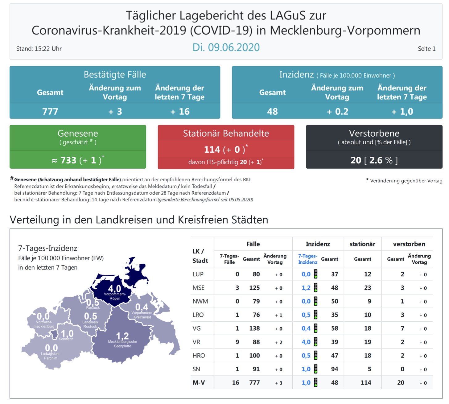 Landesweit müssen oder mussten 114 Menschen den Angaben zufolge in Kliniken behandelt werden – 20 von ihnen auf Intensivstationen. Laut einer Schätzung des Robert Koch-Instituts (RKI) sind in Mecklenburg-Vorpommern 733 Personen der positiv getesteten Menschen von einer Covid-19-Erkrankung genesen. Insgesamt gab es bislang 20 Todesfälle im Nordosten.