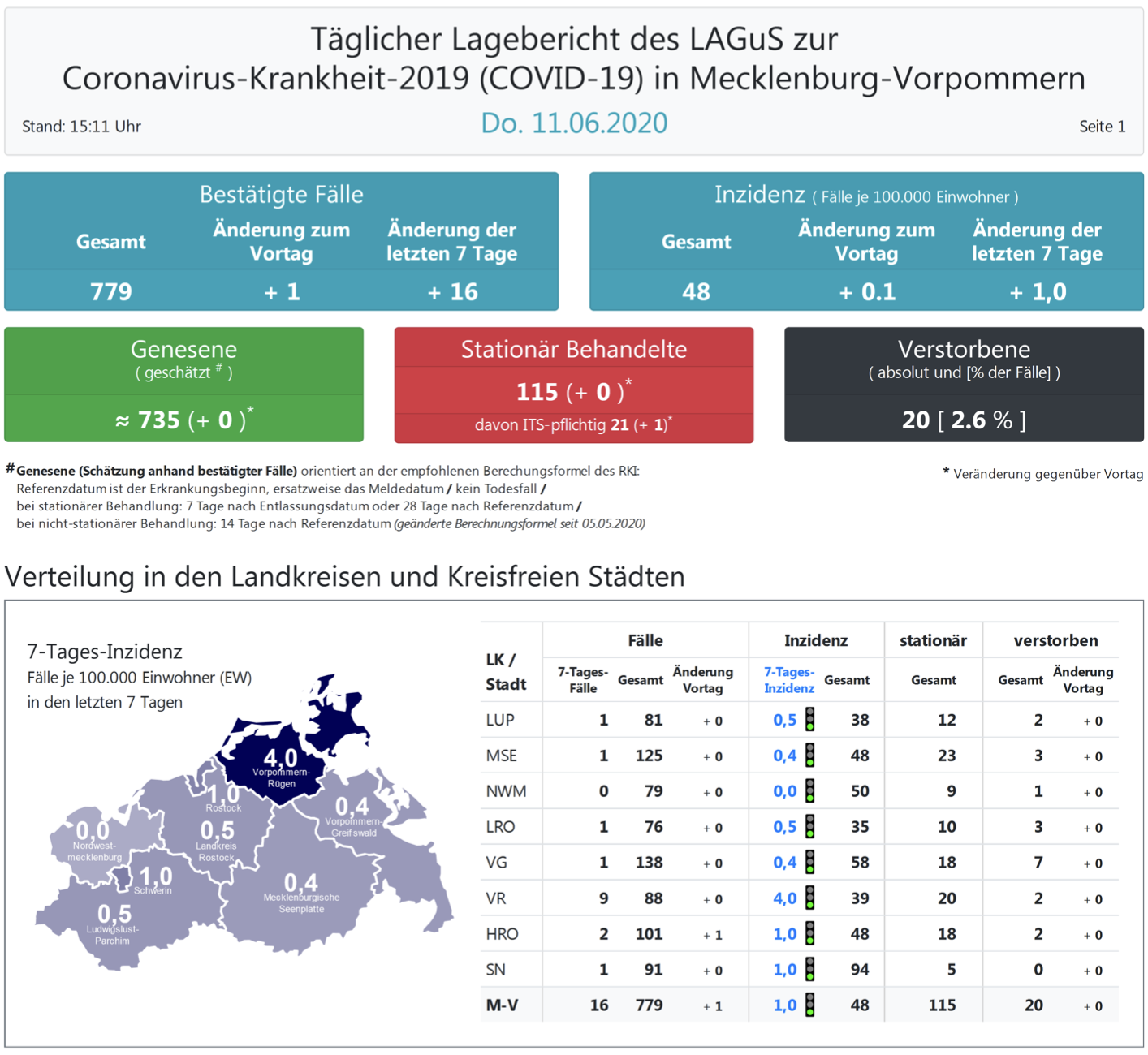 Landesweit müssen oder mussten 115 Menschen den Angaben zufolge in Kliniken behandelt werden – 21 von ihnen auf Intensivstationen. Laut einer Schätzung des Robert Koch-Instituts (RKI) sind in Mecklenburg-Vorpommern 735 Personen der positiv getesteten Menschen von einer Covid-19-Erkrankung genesen. Insgesamt gab es bislang 20 Todesfälle im Nordosten.
