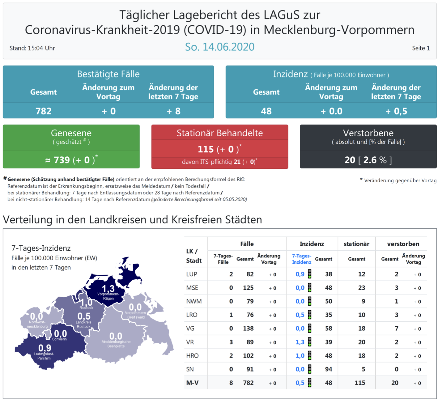 Landesweit müssen oder mussten 115 Menschen den Angaben zufolge in Kliniken behandelt werden – 21 von ihnen auf Intensivstationen. Laut einer Schätzung des Robert Koch-Instituts (RKI) sind in Mecklenburg-Vorpommern 739 Personen der positiv getesteten Menschen von einer Covid-19-Erkrankung genesen. Insgesamt gab es bislang 20 Todesfälle im Nordosten.