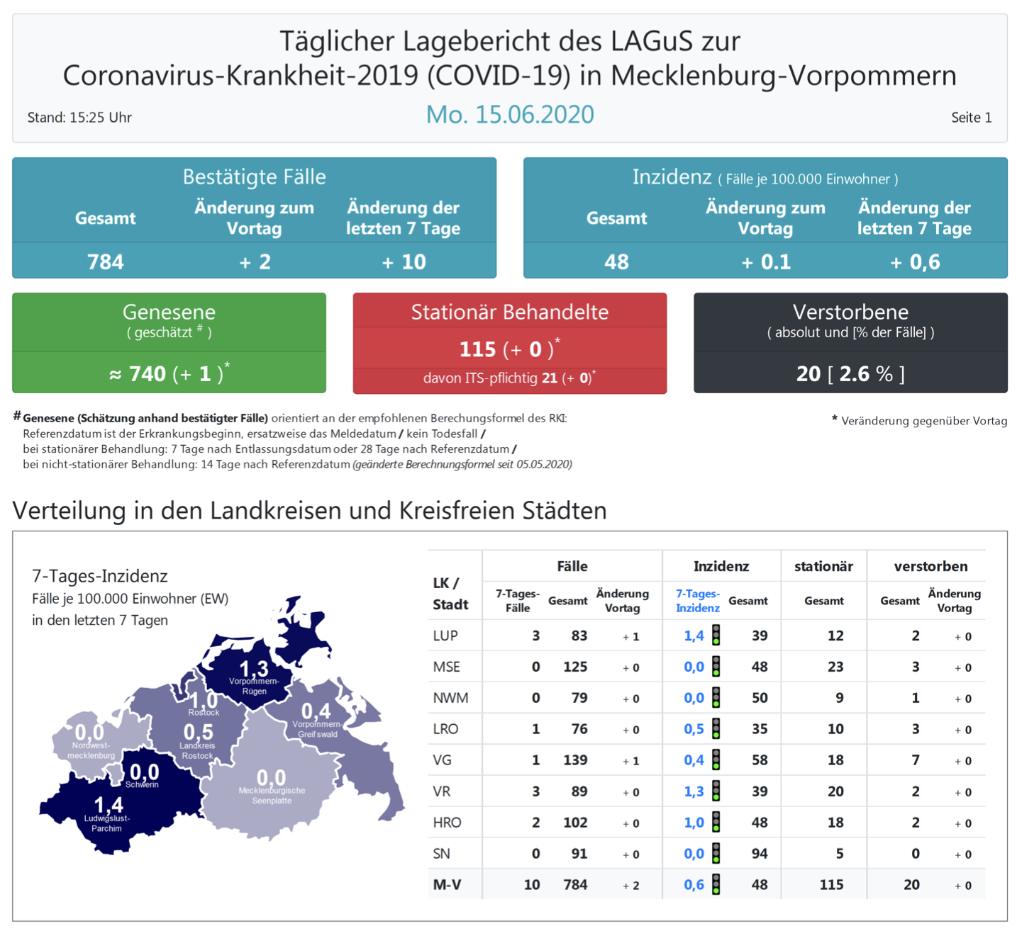 Landesweit müssen oder mussten 115 Menschen den Angaben zufolge in Kliniken behandelt werden – 21 von ihnen auf Intensivstationen. Laut einer Schätzung des Robert Koch-Instituts (RKI) sind in Mecklenburg-Vorpommern 740 Personen der positiv getesteten Menschen von einer Covid-19-Erkrankung genesen. Insgesamt gab es bislang 20 Todesfälle im Nordosten.