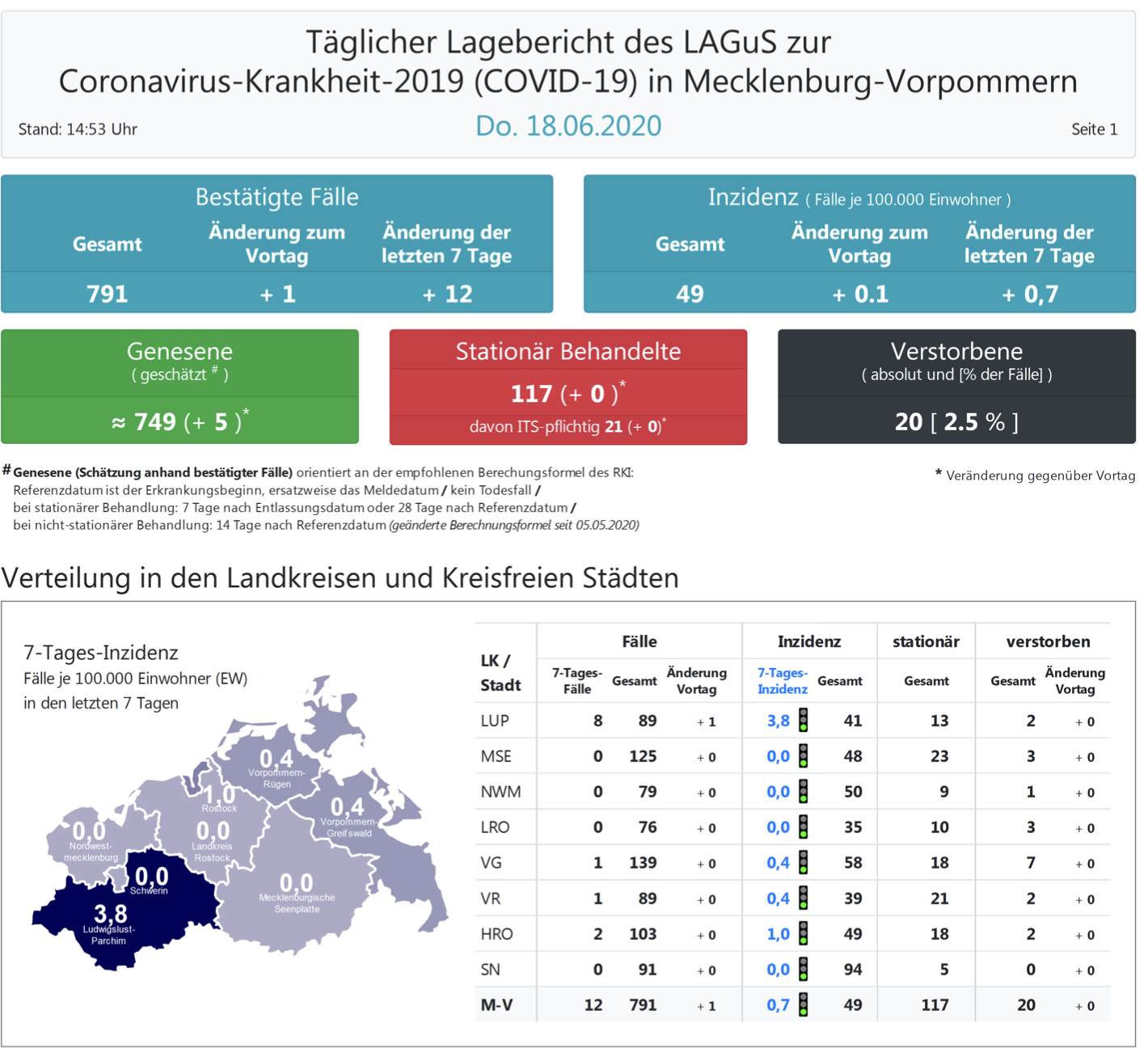 Landesweit müssen oder mussten 117 Menschen den Angaben zufolge in Kliniken behandelt werden – 21 von ihnen auf Intensivstationen. Laut einer Schätzung des Robert Koch-Instituts (RKI) sind in Mecklenburg-Vorpommern 749 (+5) Personen der positiv getesteten Menschen von einer Covid-19-Erkrankung genesen. Insgesamt gab es bislang 20 Todesfälle im Nordosten.