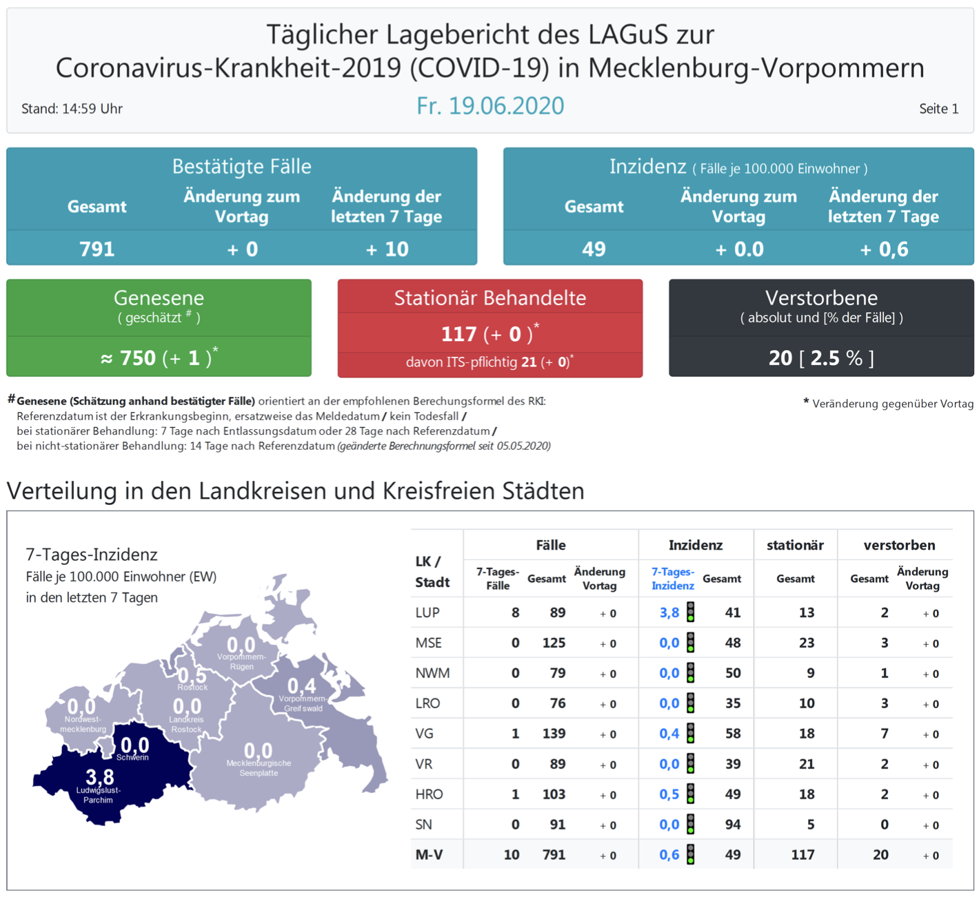 Landesweit müssen oder mussten 117 Menschen den Angaben zufolge in Kliniken behandelt werden – 21 von ihnen auf Intensivstationen. Laut einer Schätzung des Robert Koch-Instituts (RKI) sind in Mecklenburg-Vorpommern 750 (+1) Personen der positiv getesteten Menschen von einer Covid-19-Erkrankung genesen. Insgesamt gab es bislang 20 Todesfälle im Land.
