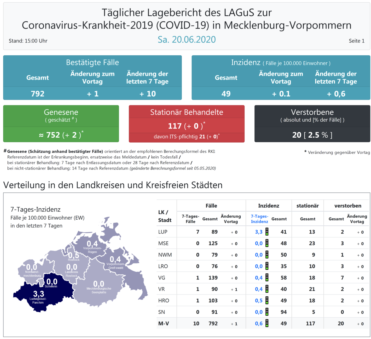Landesweit müssen oder mussten 117 Menschen den Angaben zufolge in Kliniken behandelt werden – 21 von ihnen auf Intensivstationen. Laut einer Schätzung des Robert Koch-Instituts (RKI) sind in Mecklenburg-Vorpommern 752 Personen der positiv getesteten Menschen von einer Covid-19-Erkrankung genesen. Insgesamt gab es bislang 20 Todesfälle in unserem Land.