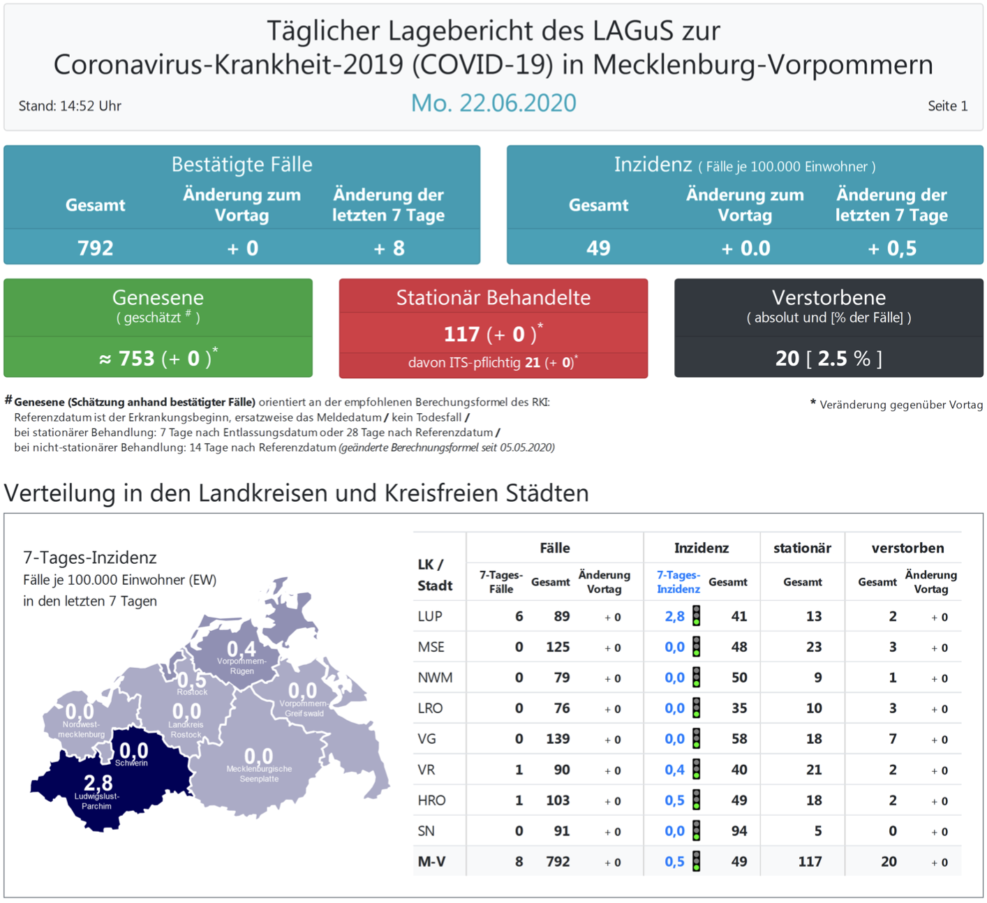 Landesweit müssen oder mussten 117 Menschen den Angaben zufolge in Kliniken behandelt werden – 21 von ihnen auf Intensivstationen. Laut einer Schätzung des Robert Koch-Instituts (RKI) sind in Mecklenburg-Vorpommern 753 Personen der positiv getesteten Menschen von einer Covid-19-Erkrankung genesen. Insgesamt gab es bislang 20 Todesfälle im Nordosten.