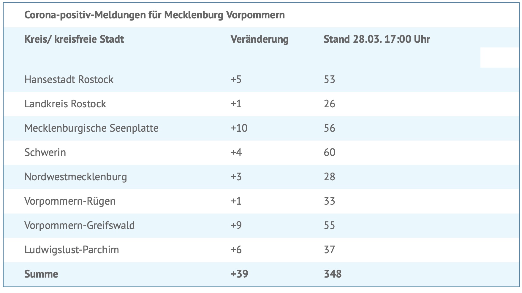 Seit gestern wurden 39 neue Corona-Infektionen aus den Landkreisen und kreisfreien Städten gemeldet – die meisten davon, nämlich 10, aus dem Landkreis Mecklenburgische Seenplatte. Insgesamt wurden bislang 348 Menschen in MV positiv auf das Virus getestet.