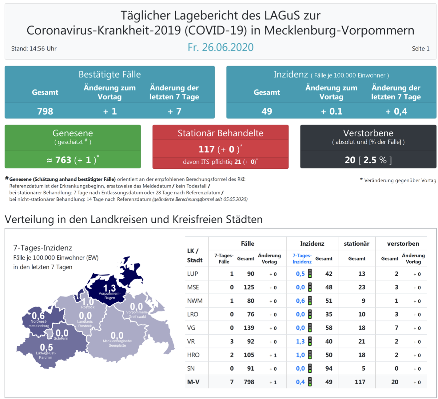 Landesweit müssen oder mussten 117 Menschen den Angaben zufolge in Kliniken behandelt werden – 21 von ihnen auf Intensivstationen. Laut einer Schätzung des Robert Koch-Instituts (RKI) sind in Mecklenburg-Vorpommern 763 Personen der positiv getesteten Menschen von einer Covid-19-Erkrankung genesen. Insgesamt gab es bislang 20 Todesfälle im Nordosten. Damit gelten 15 Personen in Mecklenburg-Vorpommern als derzeit infiziert.
