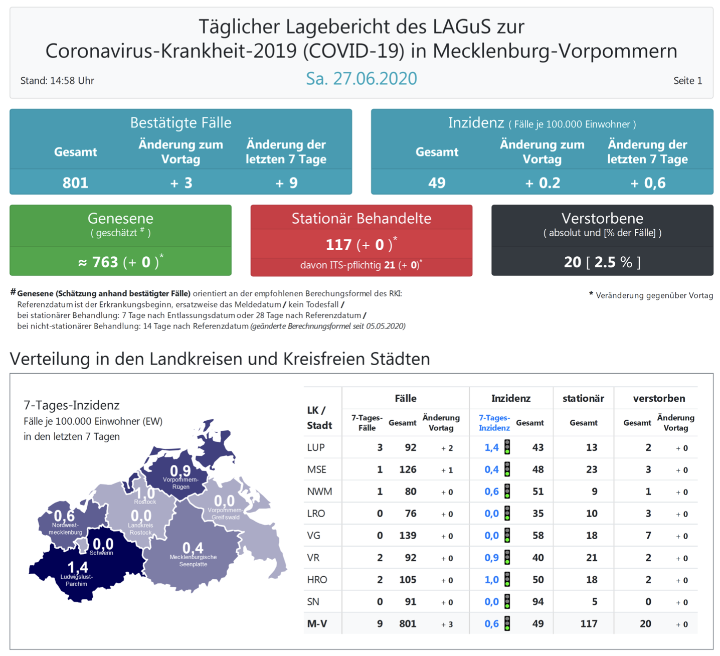 Landesweit müssen oder mussten 117 Menschen den Angaben zufolge in Kliniken behandelt werden – 21 von ihnen auf Intensivstationen. Laut einer Schätzung des Robert Koch-Instituts (RKI) sind in Mecklenburg-Vorpommern 763 Personen der positiv getesteten Menschen von einer Covid-19-Erkrankung genesen. Insgesamt gab es bislang 20 Todesfälle im Nordosten. Damit gelten 18 Personen in Mecklenburg-Vorpommern als derzeit infiziert.