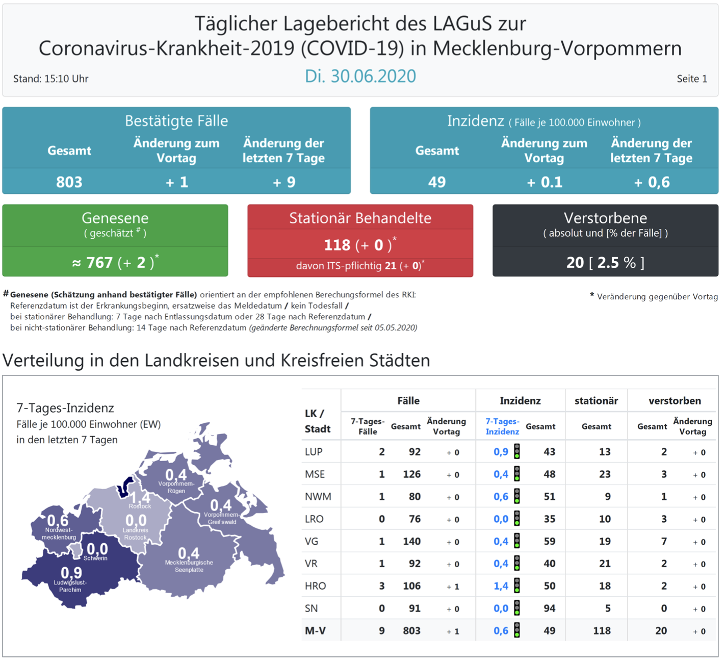 Landesweit müssen oder mussten 118 (+1) Menschen den Angaben zufolge in Kliniken behandelt werden – 21 von ihnen auf Intensivstationen. Laut einer Schätzung des Robert Koch-Instituts (RKI) sind in Mecklenburg-Vorpommern 767 Personen der positiv getesteten Menschen von einer Covid-19-Erkrankung genesen. Insgesamt gab es bislang 20 Todesfälle im Land.