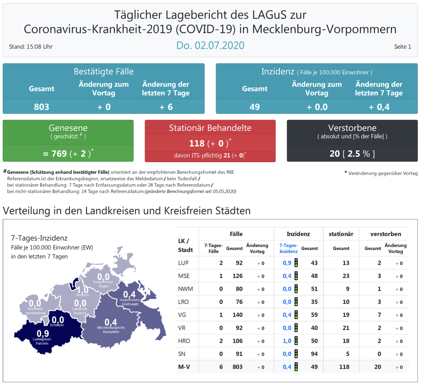 Landesweit müssen oder mussten 118 Menschen den Angaben zufolge in Kliniken behandelt werden – 21 von ihnen auf Intensivstationen. Laut einer Schätzung des Robert Koch-Instituts (RKI) sind in Mecklenburg-Vorpommern 769 Personen der positiv getesteten Menschen von einer Covid-19-Erkrankung genesen. Insgesamt gab es bislang 20 Todesfälle im Land.