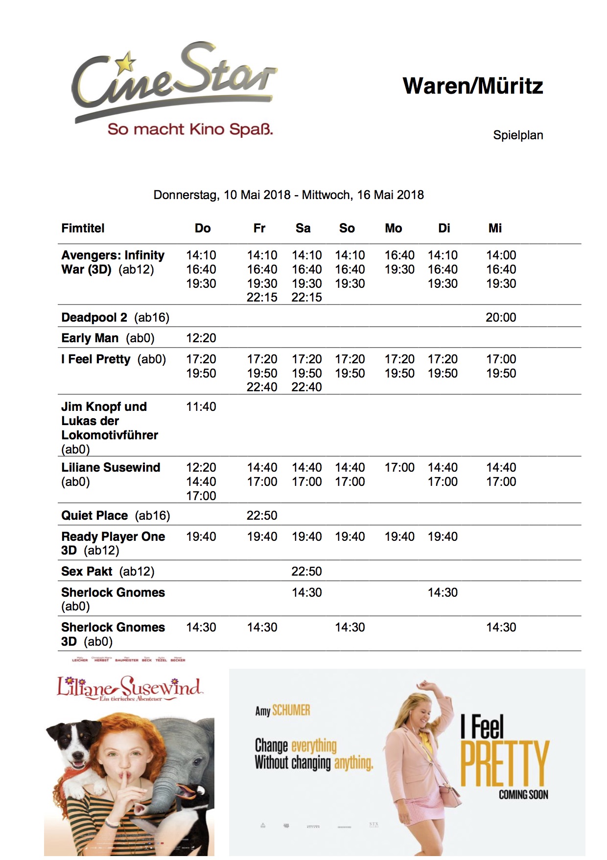 Und hier das neue, ab morgen gültige Kinoprogramm für das CineStar in Waren: