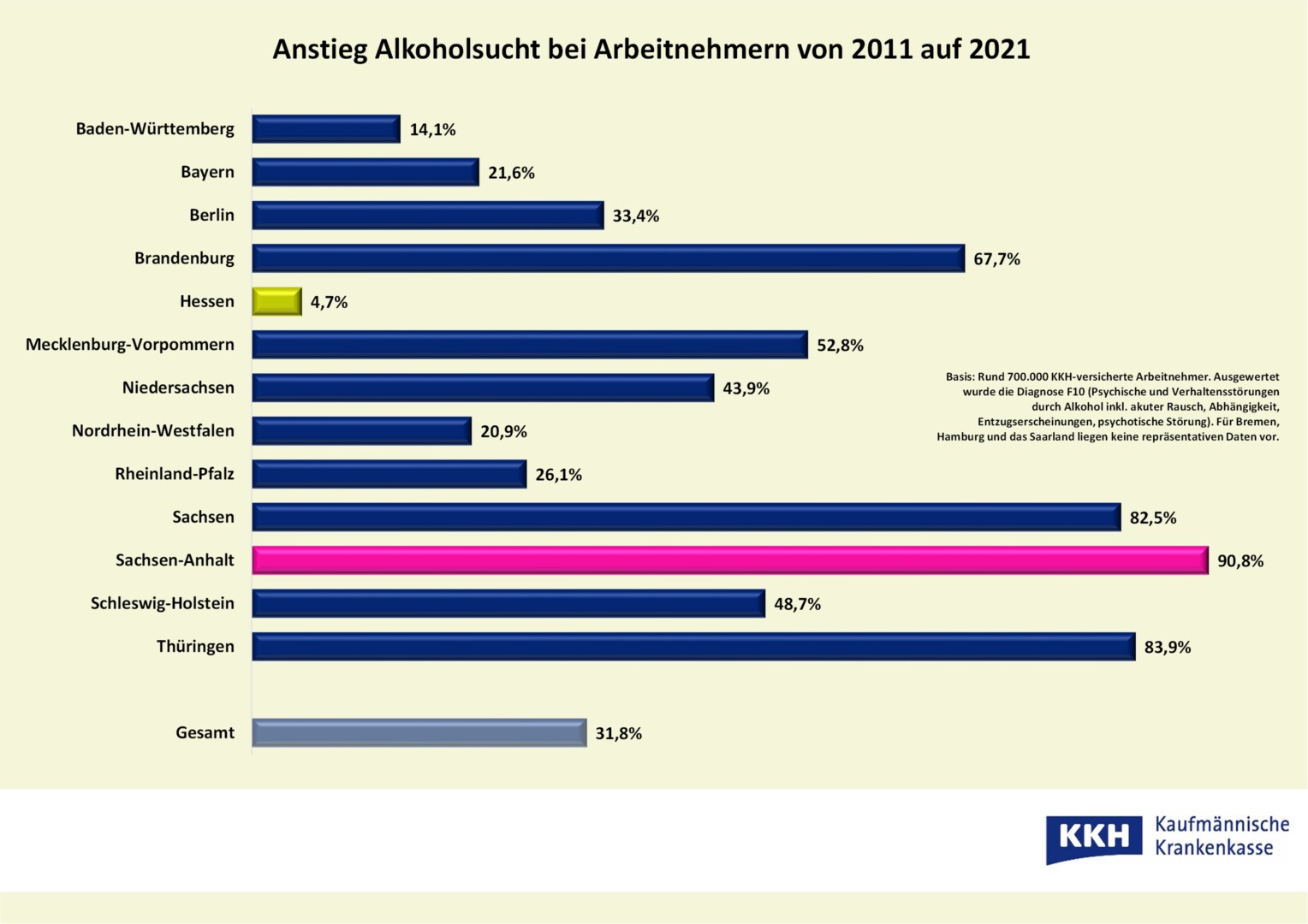 Für sie spielt die Fastenzeit keine Rolle, sie können einfach nicht verzichten: Immer mehr Beschäftigte in Mecklenburg-Vorpommern sind alkoholsüchtig – mit weitreichenden Folgen für Gesundheit, Privatleben, Job und Wirtschaft. Laut Daten der KKH Kaufmännische Krankenkasse ist die Zahl der Berufstätigen mit exzessivem Alkoholkonsum im Nordosten von 2011 auf 2021 um knapp 53 Prozent gestiegen. Das bundesweite Mittel liegt bei rund 32 Prozent. Den größten Anstieg verzeichnet die KKH mit rund 91 Prozent in Sachsen-Anhalt, den geringsten mit knapp fünf Prozent in Hessen.