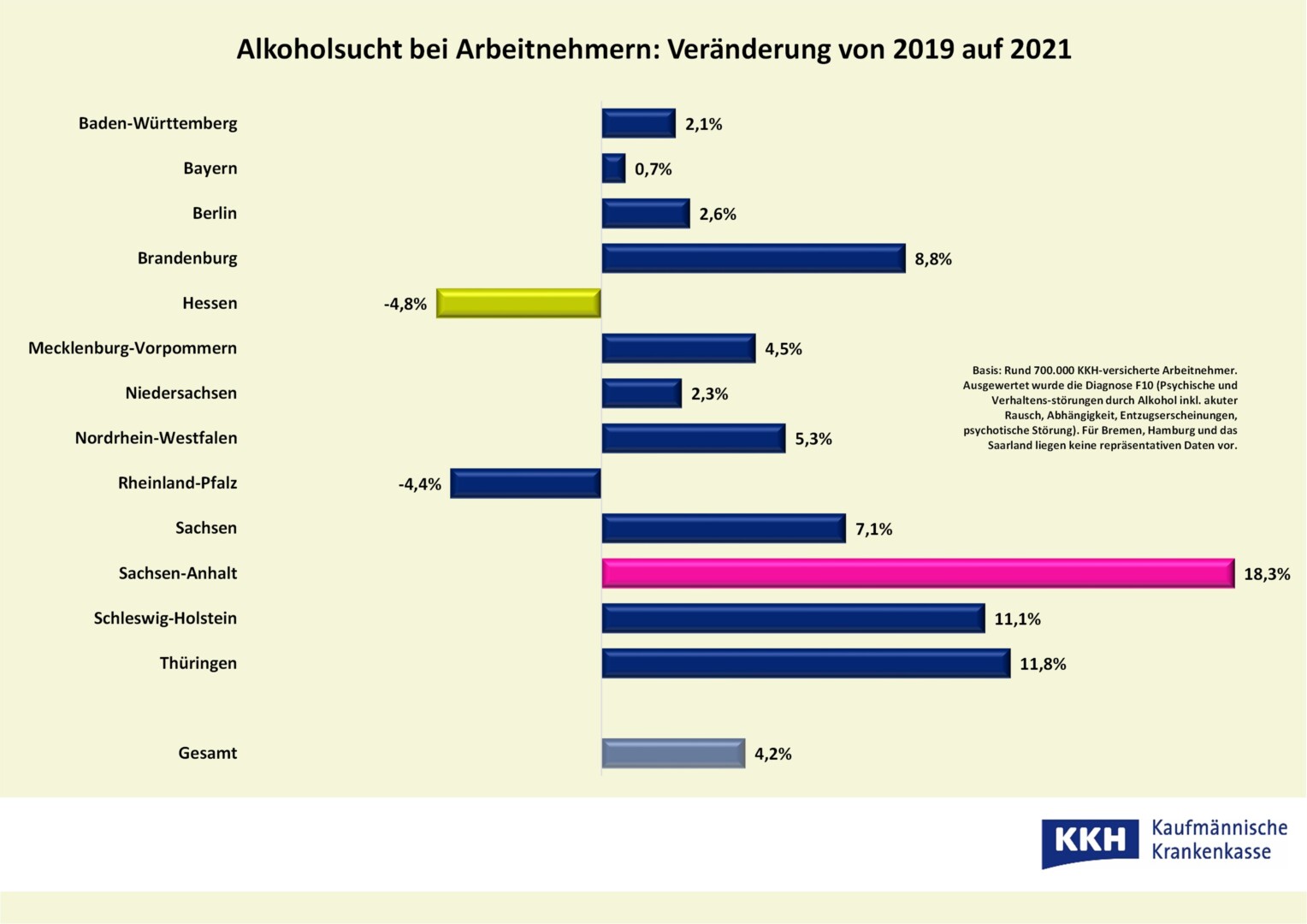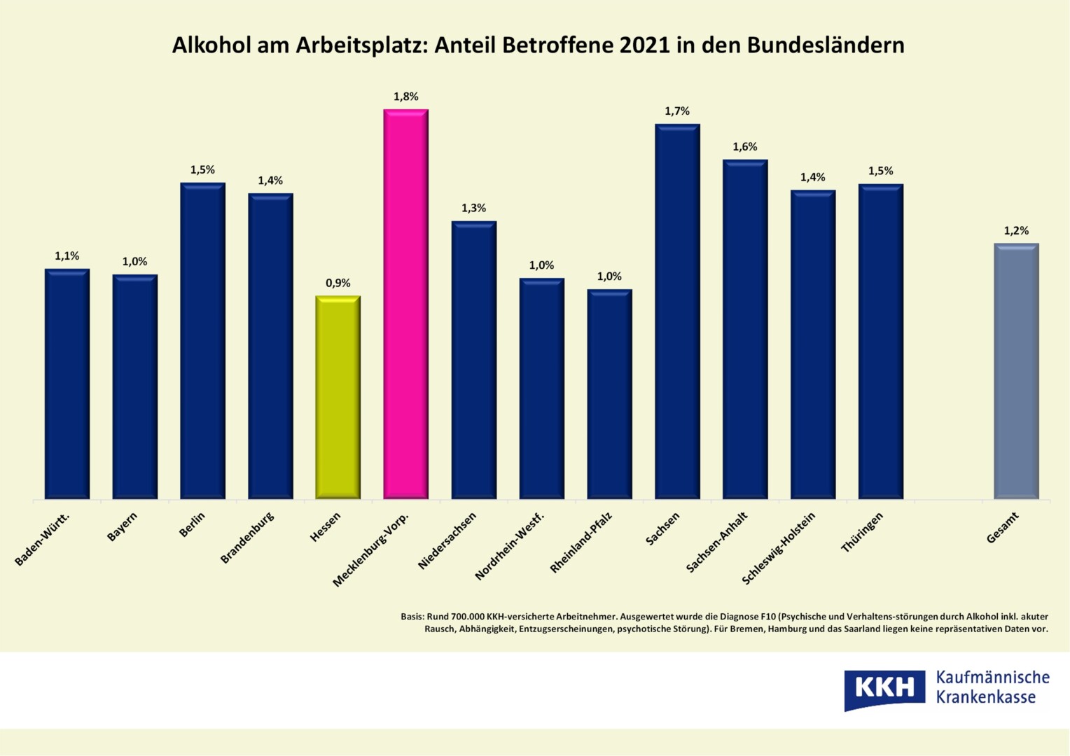 Michael Falkenstein, KKH-Experte für Suchtfragen: „Die Gefahren durch Alkohol werden oft unterschätzt und erst dann als Problem wahrgenommen, wenn die Grenze zu Missbrauch und Abhängigkeit bereits überschritten ist.“ Hinzu kommt, dass die meisten viel zu spät Hilfe suchen, denn die Scham ist groß. So sind die erhobenen Daten auch nur die Spitze des Eisbergs, die Dunkelziffer dafür umso höher. Falkenstein empfiehlt Mitarbeitern, die Alkoholprobleme bei Kollegen beobachten, sich an die nächsthöhere Führungskraft oder auch den Betriebsarzt des Unternehmens zu wenden: „Keinesfalls sollten problematischer Konsum gedeckt und die Auswirkungen durch andere ausgeglichen werden“, betont der Experte.