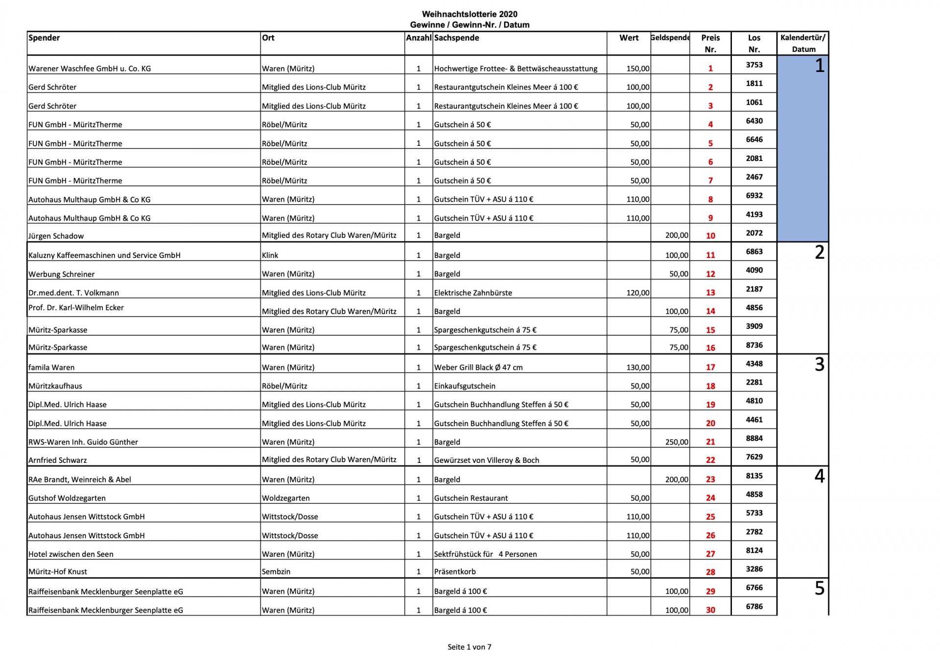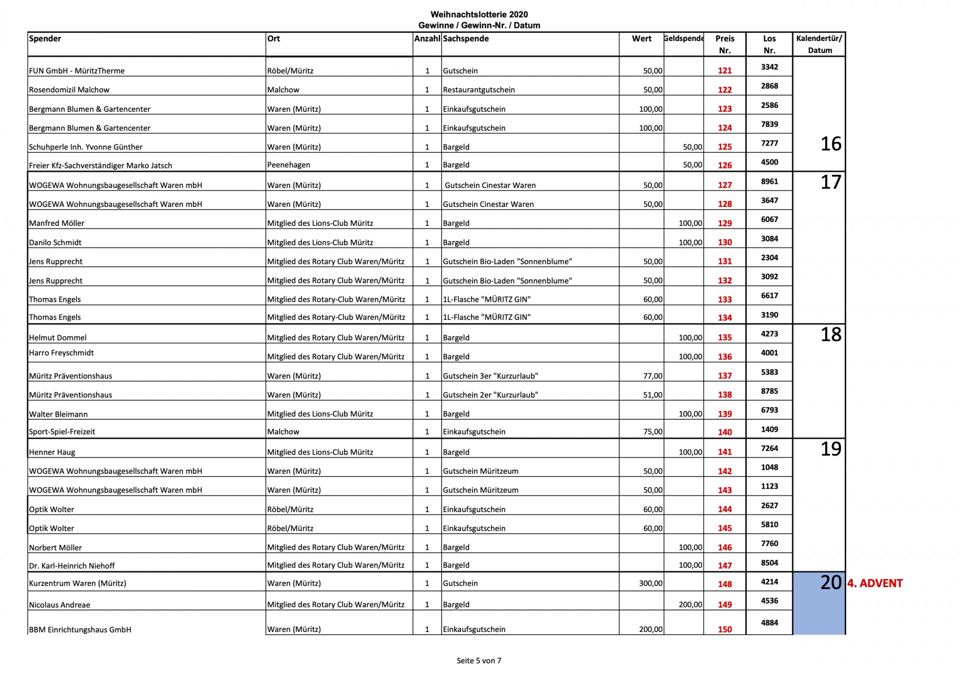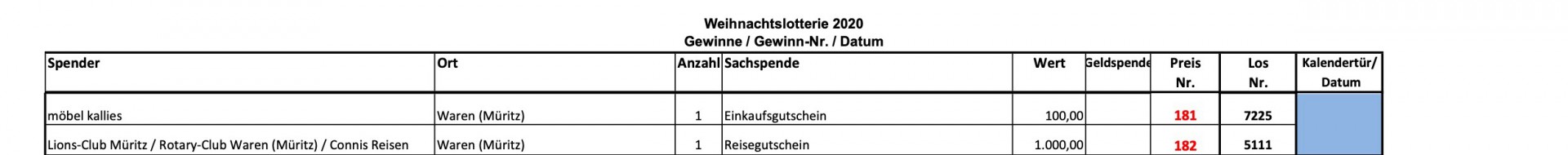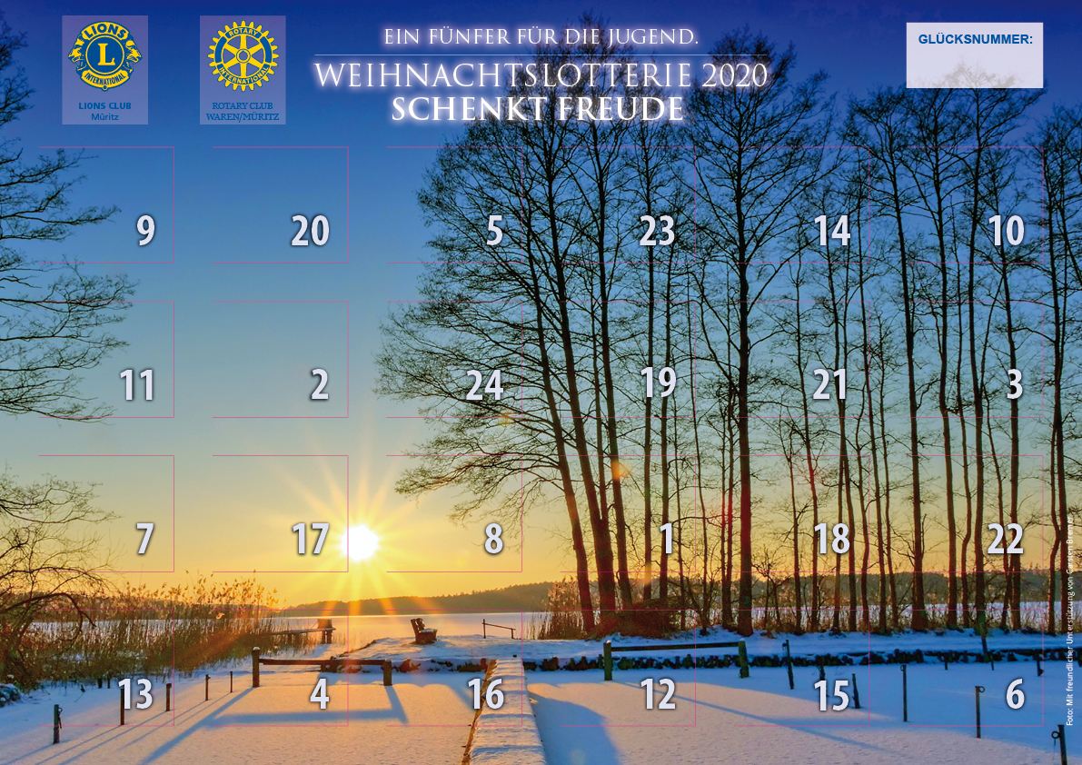 Auf vielfachen Wunsch veröffentlicht „Wir sind Müritzer“ heute noch einmal sämtliche Gewinnzahlen der Weihnachtslotterie 2020 des Lionsclub Müritz und des Rotary Club Waren. Insgesamt warteten hinter den 24 Türchen 182 Preise im Wert von etwa 17 400 Euro, viele sind bislang noch nicht abgeholt worden.