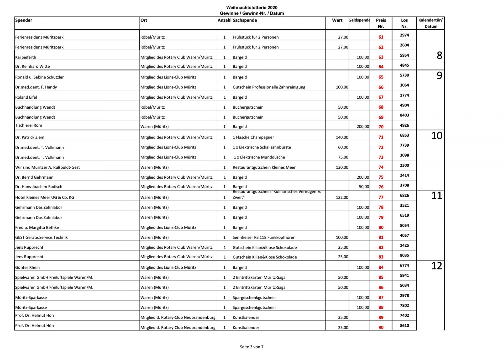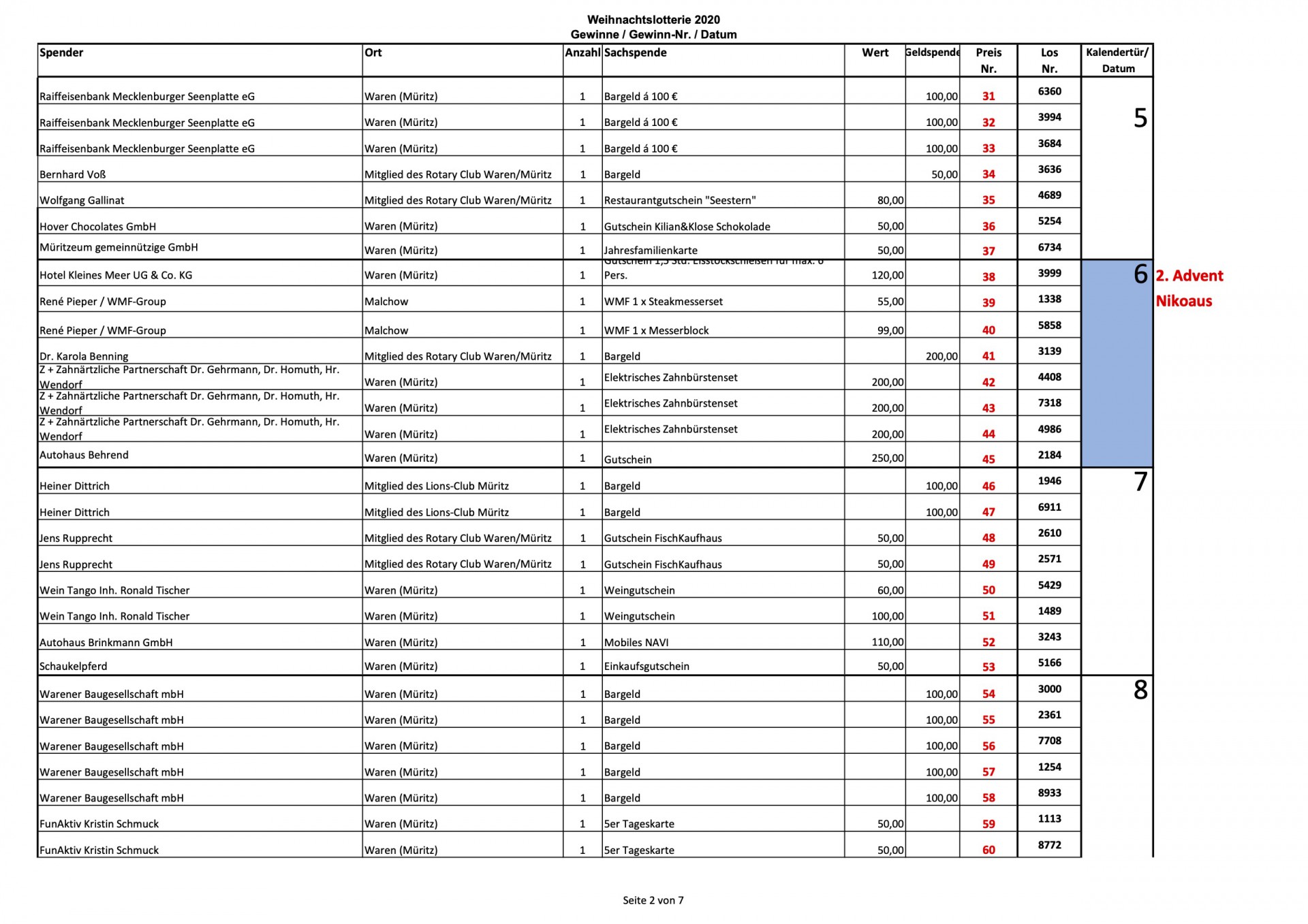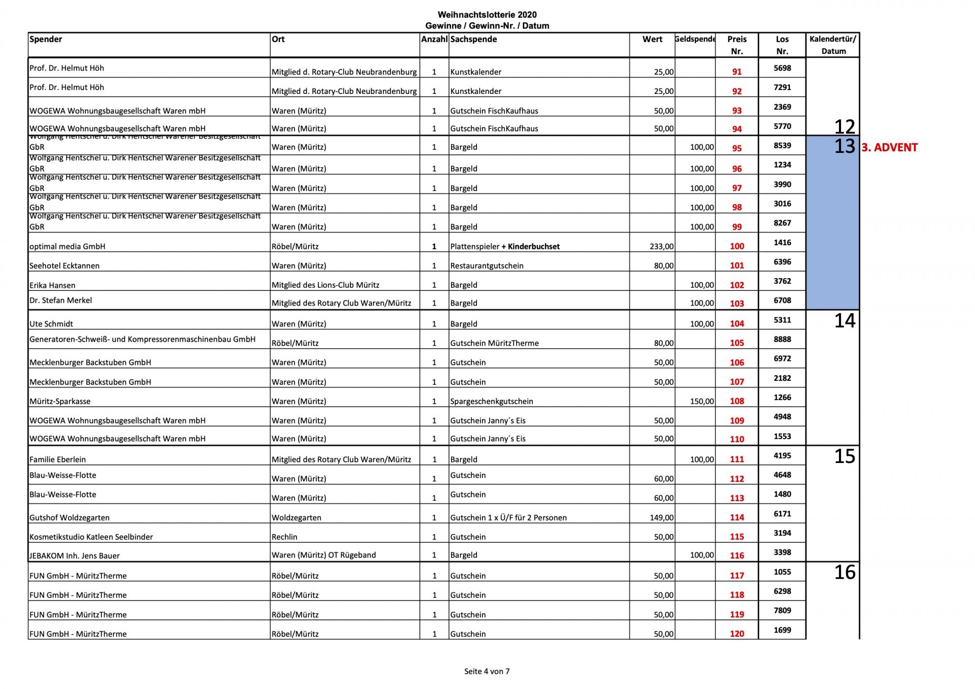 Auf vielfachen Wunsch veröffentlicht „Wir sind Müritzer“ heute noch einmal sämtliche Gewinnzahlen der Weihnachtslotterie 2020 des Lionsclub Müritz und des Rotary Club Waren. Insgesamt warteten hinter den 24 Türchen 182 Preise im Wert von etwa 17 400 Euro, viele sind bislang noch nicht abgeholt worden.