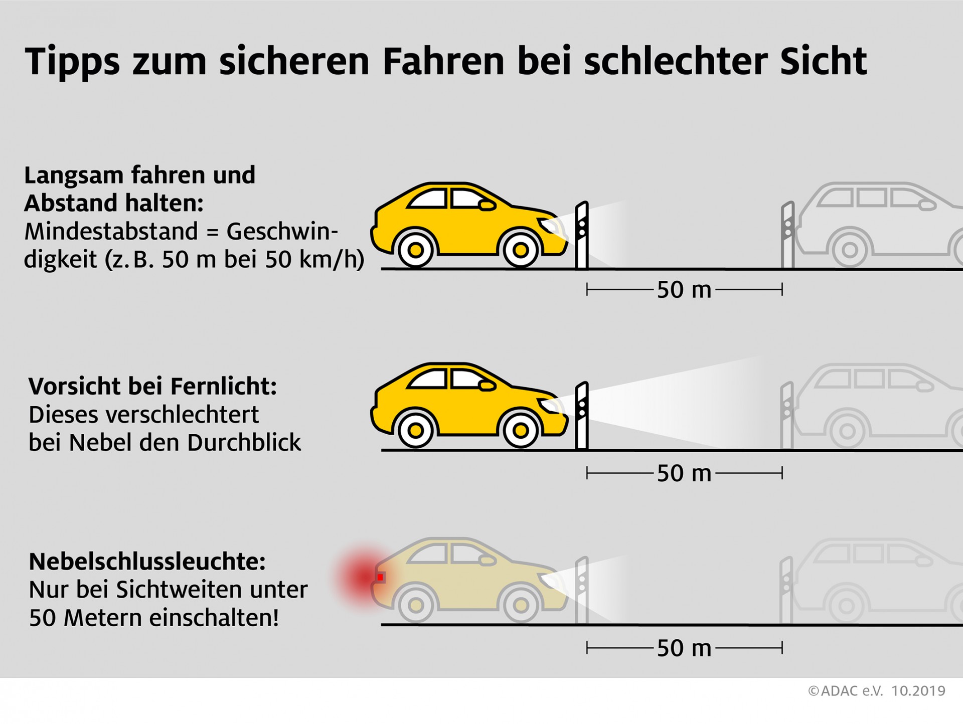 Bei eingeschränkter Sicht müssen Autofahrer generell langsam und vorausschauend fahren, jederzeit bremsbereit sein und für eine ausreichende Front- als auch Heckbeleuchtung sorgen. Achtung: Eine Lichtautomatik ist hier nur selten zuverlässig. Das Tagfahrlicht betrifft meist nur die vorderen Scheinwerfer, nicht aber das Rücklicht. Der ADAC empfiehlt daher das Abblendlicht manuell einzuschalten. Überholmanöver sind tabu, jegliche Ablenkung sollte vermieden werden. Wenn das Fahrzeug mit Nebelscheinwerfern ausgestattet ist, sollten diese zusätzlich eingeschaltet werden. Die Nebelscheinwerfer dürfen dann genutzt werden, wenn Nebel, Schneefall oder Regen die Sichtweite erheblich reduzieren. Sobald sich die Sichtverhältnisse bessern, müssen auch die Nebenscheinwerfer wieder ausgeschaltet werden.
