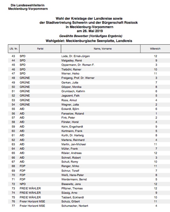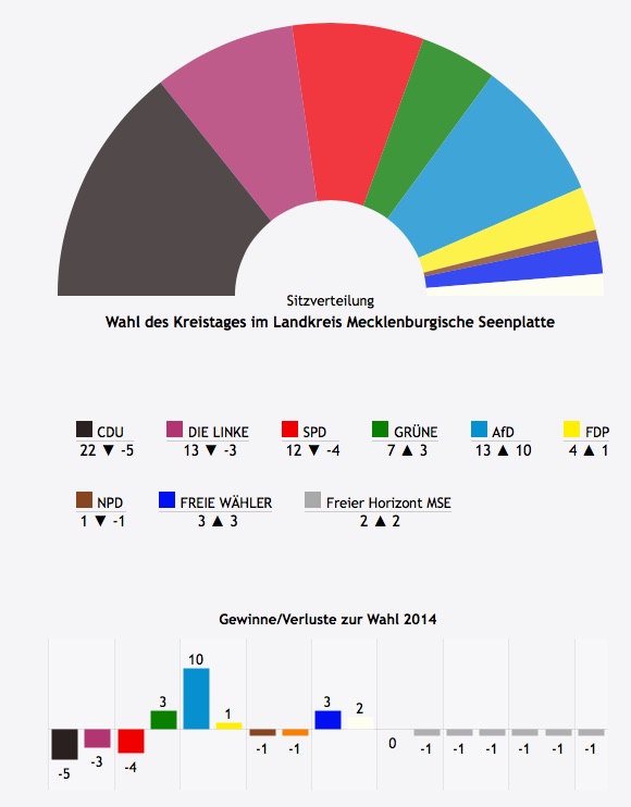 Auch für den Landrat des Kreises Mecklenburgische Seenplatte, Heiko Kärger (CDU) wird das „Regieren“ in den kommenden Jahren schwieriger. „Seine“ CDU kommt nur noch auf 22 Sitze – fünf weniger als bisher. Neu im Kreistag: Die Freien Wähler mit 3 Sitzen sowie der „Freie Horizont“ mit zwei Sitzen. Gewinner auch hier eindeutig die AfD, die jetzt 13 Sitze hat – 10 mehr als bisher. Die NPD ist weiterhin vertreten, aber nur noch mit einem Abgeordneten.