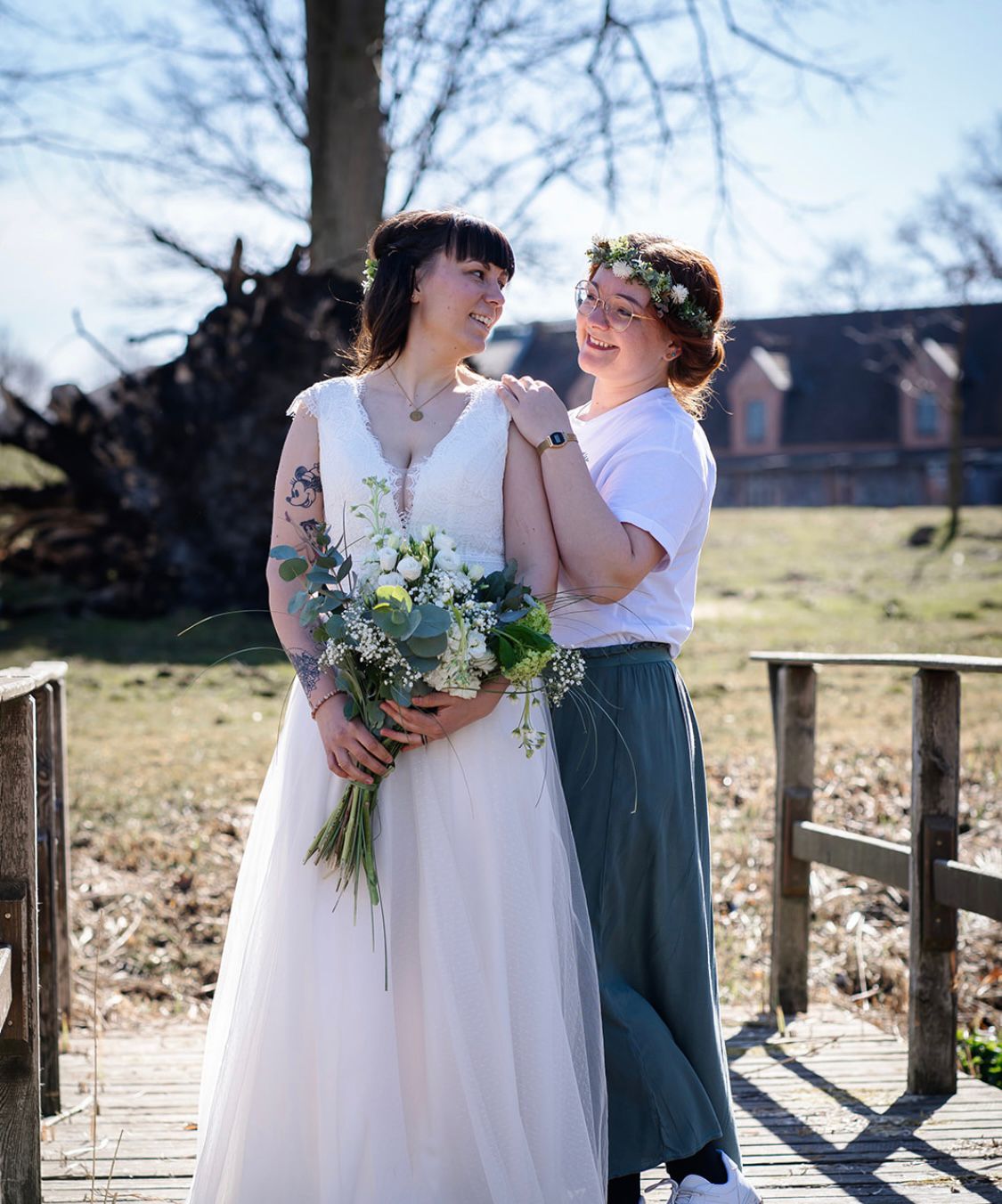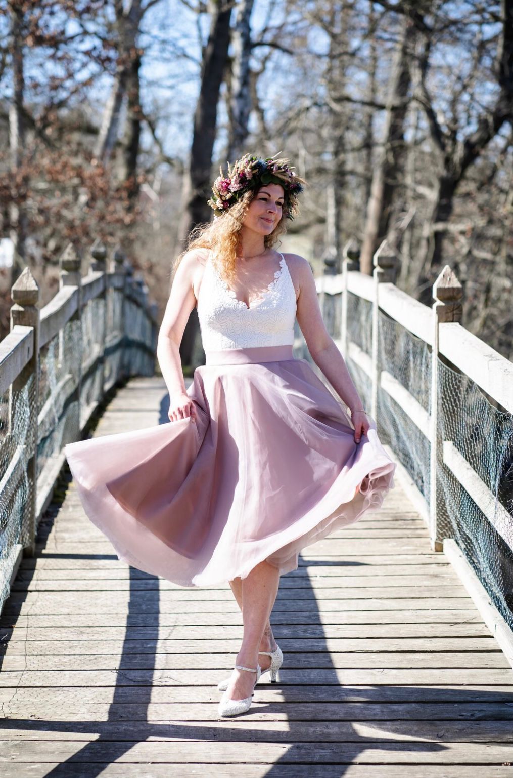 Eigentlich hat Maria einen anderen Beruf, Brautmoden sind “nur” ihr Hobby. Und das lebt sie im Gutshaus Alt Schönau aus. Zwischen alten, großen Bäumen und inmitten eines urigen Park liegt ihr kleines Geschäft. Wer zu ihr kommt, wird herzlich empfangen – von Maria, die zumeist einen Blumenkranz im Haar trägt. Der passt zu ihr und ihrer fröhlichen Art.