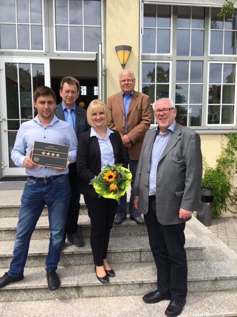 Foto: Gerd Schröter und Roland Metzig von der DEHOGA (hinten) übergaben die „Vier Sterne“ an Dr. Gunnar Thies, Geschäftsführerin Julia Winkler sowie Assistent Hannes Thies.