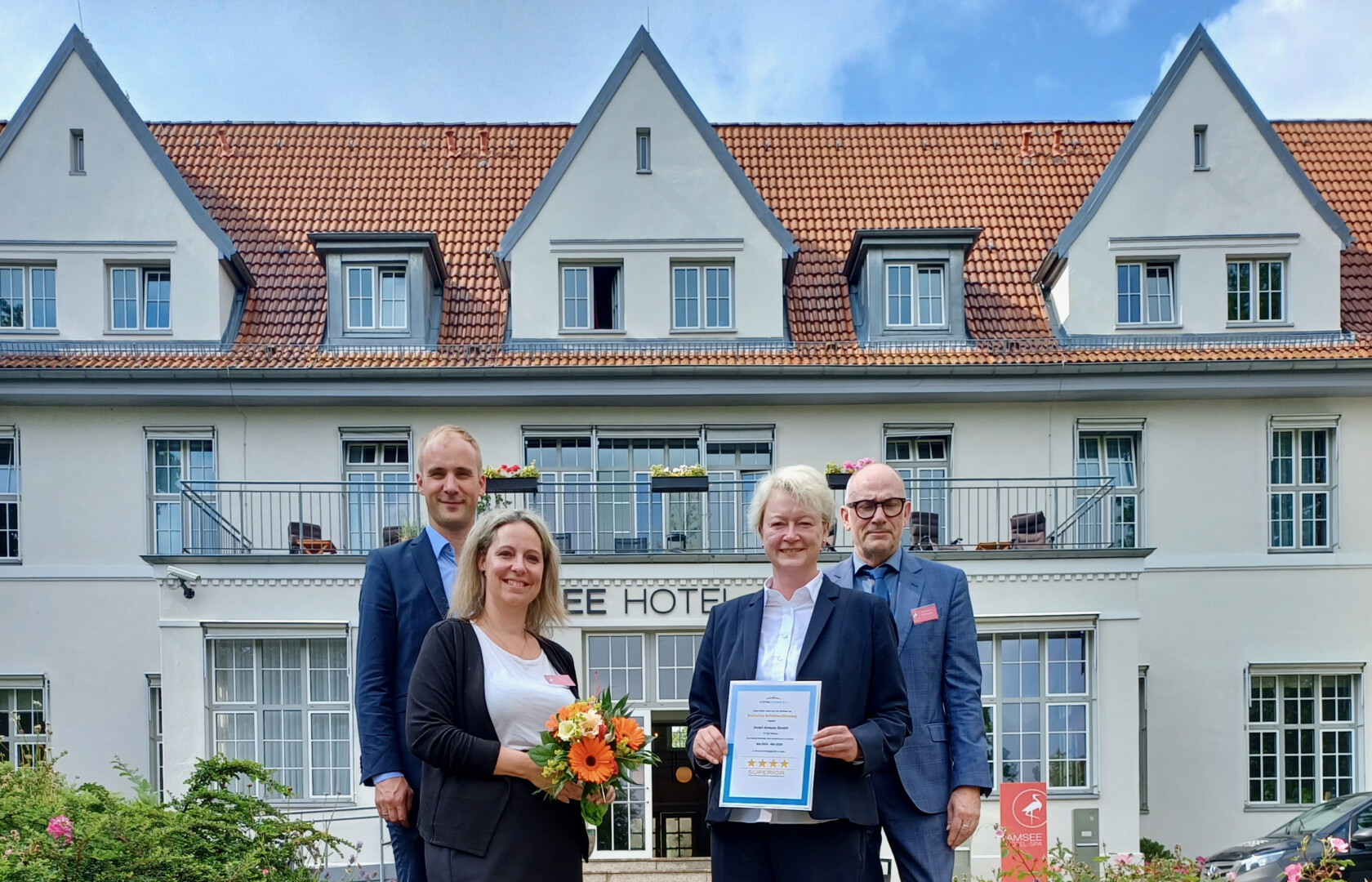 Glückwünsche gehen ans SPA Hotel Amsee, das in dieser Woche die neue Plakette mit „vier Sternen Superior“ von der DEHOGA erhalten hat. „Wir sind stolz, nun das Angebot von Waren mit einem 4-Sterne-Superior-Haus ergänzen zu dürfen. Dafür wurden in den letzten Jahren einige Investitionen getätigt, wie zum Beispiel neue Fasssaunen im Außenbereich, neue Innenhof-Terrasse, neue Betten sowie die Neugestaltung der Strandbar“, so Direktorin Anika Waß. Damit ist jetzt aber nicht Schluss, die Geschäftsführer Gunnar und Hannes Thies haben weitere Investitionen geplant und wollen dabei unter anderem auf mehr Nachhaltigkeit setzen.